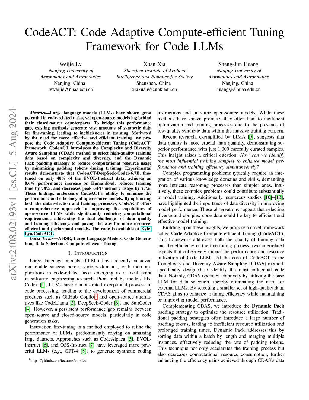 Large language models (LLMs) have shown great potential in code-related tasks, yet open-source models lag behind their closed-source counterparts. To bridge this performance gap, existing methods generate vast amounts of synthetic data for fine-tuning, leading to inefficiencies in training. Motivated by the need for more effective and efficient training, we propose the Code Adaptive Compute-efficient Tuning (CodeACT) framework. CodeACT introduces the Complexity and Diversity Aware Sampling (CDAS) method to select high-quality training data based on complexity and diversity, and the Dynamic Pack padding strategy to reduce computational resource usage by minimizing padding tokens during training. Experimental results demonstrate that CodeACT-DeepSeek-Coder-6.7B, fine-tuned on only 40% of the EVOL-Instruct data, achieves an 8.6% performance increase on HumanEval, reduces training time by 78%, and decreases peak GPU memory usage by 27%. These findings underscore CodeACT's ability to enhance the performance and efficiency of open-source models. By optimizing both the data selection and training processes, CodeACT offers a comprehensive approach to improving the capabilities of open-source LLMs while significantly reducing computational requirements, addressing the dual challenges of data quality and training efficiency, and paving the way for more resource-efficient and performant models.