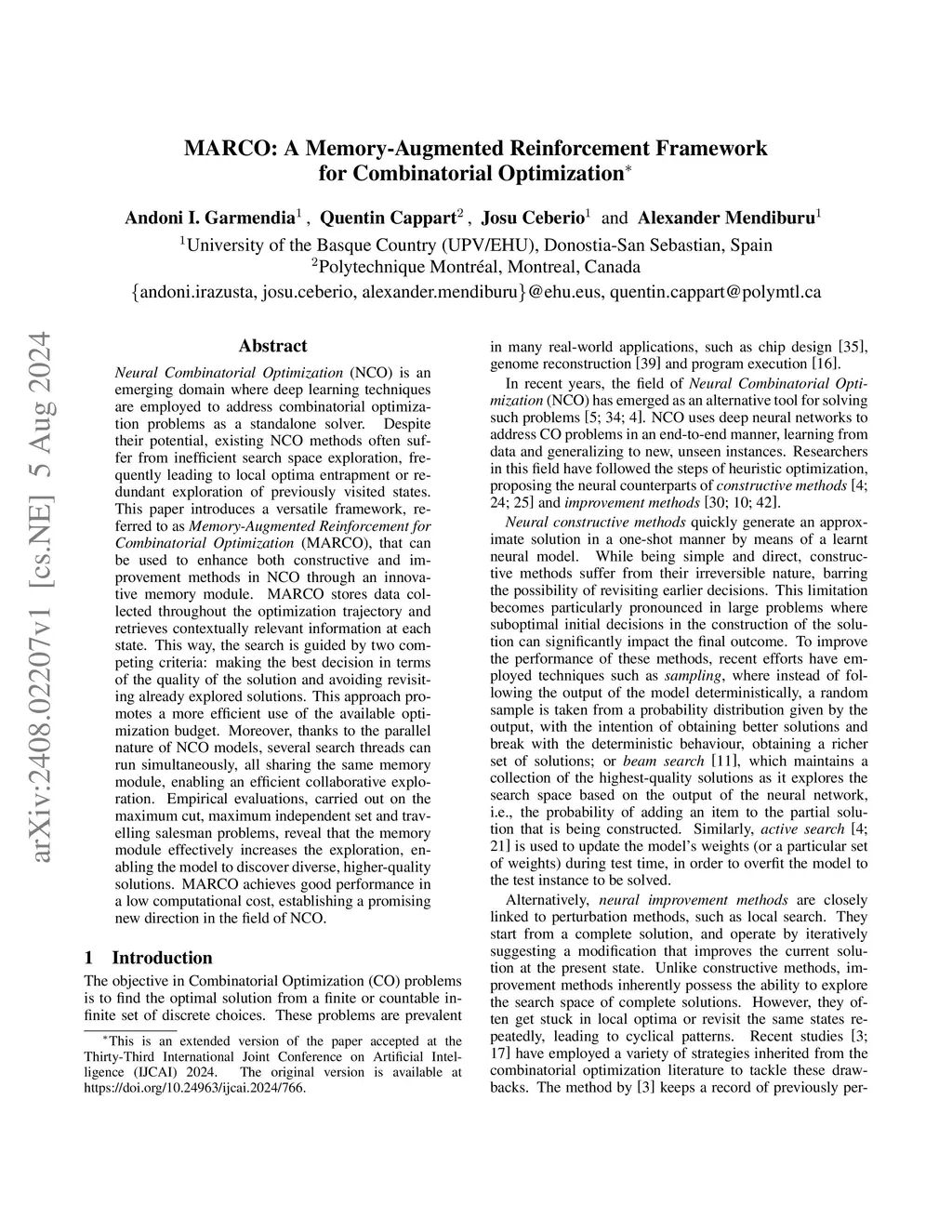 Neural Combinatorial Optimization (NCO) is an emerging domain where deep learning techniques are employed to address combinatorial optimization problems as a standalone solver. Despite their potential, existing NCO methods often suffer from inefficient search space exploration, frequently leading to local optima entrapment or redundant exploration of previously visited states. This paper introduces a versatile framework, referred to as Memory-Augmented Reinforcement for Combinatorial Optimization (MARCO), that can be used to enhance both constructive and improvement methods in NCO through an innovative memory module. MARCO stores data collected throughout the optimization trajectory and retrieves contextually relevant information at each state. This way, the search is guided by two competing criteria: making the best decision in terms of the quality of the solution and avoiding revisiting already explored solutions. This approach promotes a more efficient use of the available optimization budget. Moreover, thanks to the parallel nature of NCO models, several search threads can run simultaneously, all sharing the same memory module, enabling an efficient collaborative exploration. Empirical evaluations, carried out on the maximum cut, maximum independent set and travelling salesman problems, reveal that the memory module effectively increases the exploration, enabling the model to discover diverse, higher-quality solutions. MARCO achieves good performance in a low computational cost, establishing a promising new direction in the field of NCO.