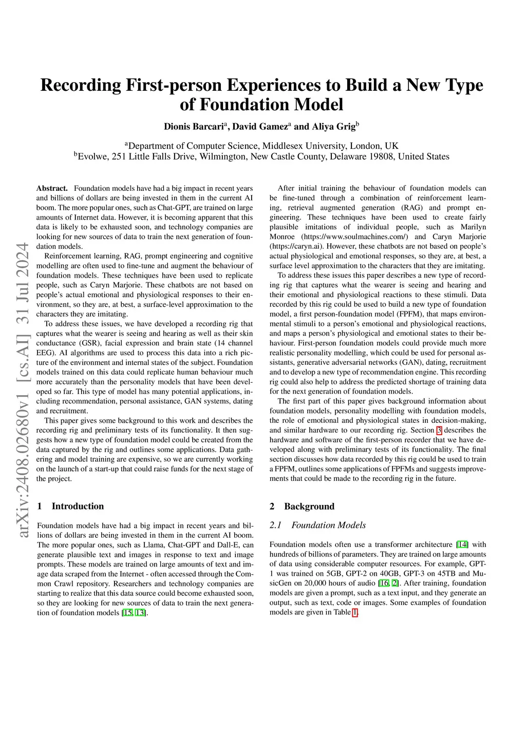 Foundation models have had a big impact in recent years and billions of dollars are being invested in them in the current AI boom. The more popular ones, such as Chat-GPT, are trained on large amounts of Internet data. However, it is becoming apparent that this data is likely to be exhausted soon, and technology companies are looking for new sources of data to train the next generation of foundation models. Reinforcement learning, RAG, prompt engineering and cognitive modelling are often used to fine-tune and augment the behaviour of foundation models. These techniques have been used to replicate people, such as Caryn Marjorie. These chatbots are not based on people's actual emotional and physiological responses to their environment, so they are, at best, a surface-level approximation to the characters they are imitating. To address these issues, we have developed a recording rig that captures what the wearer is seeing and hearing as well as their skin conductance (GSR), facial expression and brain state (14 channel EEG). AI algorithms are used to process this data into a rich picture of the environment and internal states of the subject. Foundation models trained on this data could replicate human behaviour much more accurately than the personality models that have been developed so far. This type of model has many potential applications, including recommendation, personal assistance, GAN systems, dating and recruitment. This paper gives some background to this work and describes the recording rig and preliminary tests of its functionality. It then suggests how a new type of foundation model could be created from the data captured by the rig and outlines some applications. Data gathering and model training are expensive, so we are currently working on the launch of a start-up that could raise funds for the next stage of the project.