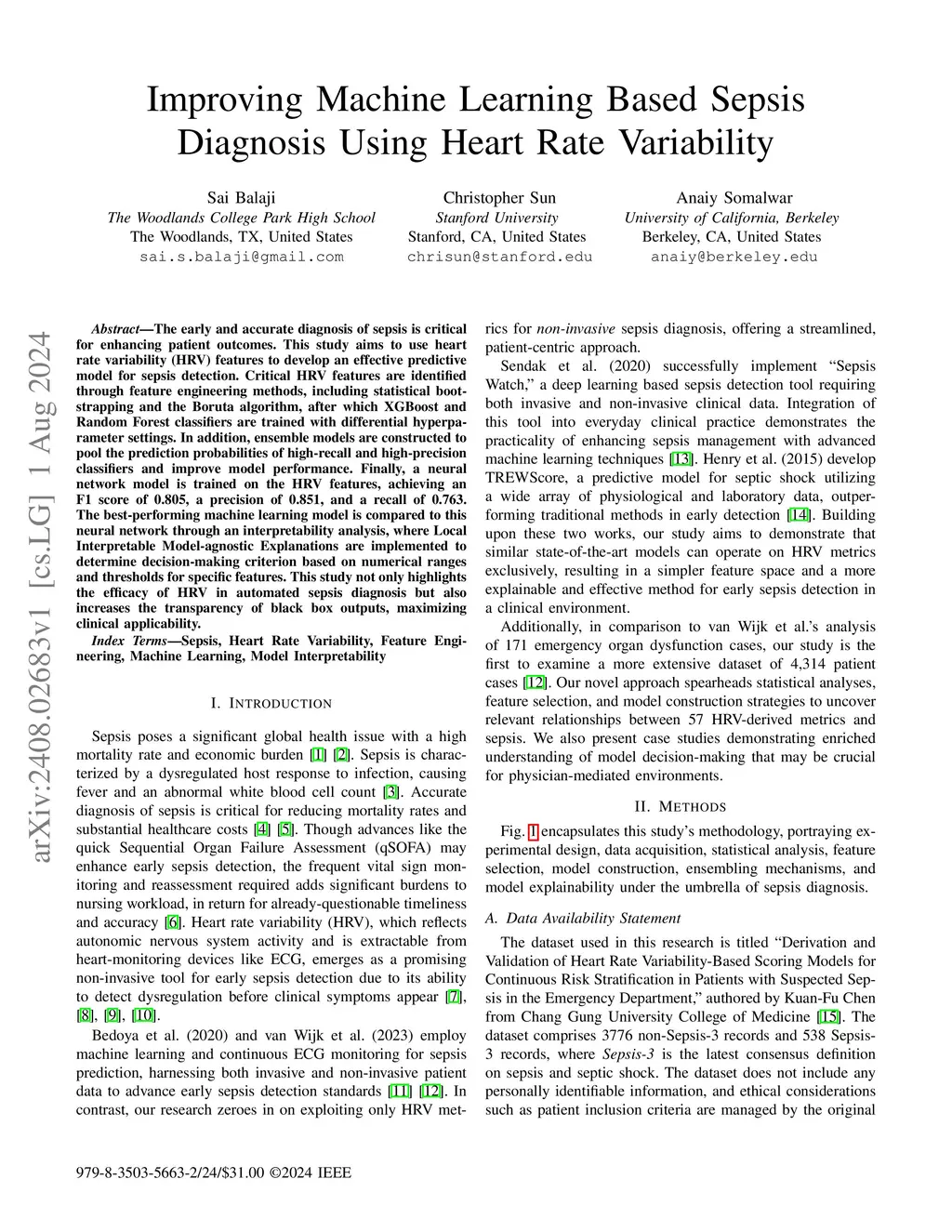 The early and accurate diagnosis of sepsis is critical for enhancing patient outcomes. This study aims to use heart rate variability (HRV) features to develop an effective predictive model for sepsis detection. Critical HRV features are identified through feature engineering methods, including statistical bootstrapping and the Boruta algorithm, after which XGBoost and Random Forest classifiers are trained with differential hyperparameter settings. In addition, ensemble models are constructed to pool the prediction probabilities of high-recall and high-precision classifiers and improve model performance. Finally, a neural network model is trained on the HRV features, achieving an F1 score of 0.805, a precision of 0.851, and a recall of 0.763. The best-performing machine learning model is compared to this neural network through an interpretability analysis, where Local Interpretable Model-agnostic Explanations are implemented to determine decision-making criterion based on numerical ranges and thresholds for specific features. This study not only highlights the efficacy of HRV in automated sepsis diagnosis but also increases the transparency of black box outputs, maximizing clinical applicability.