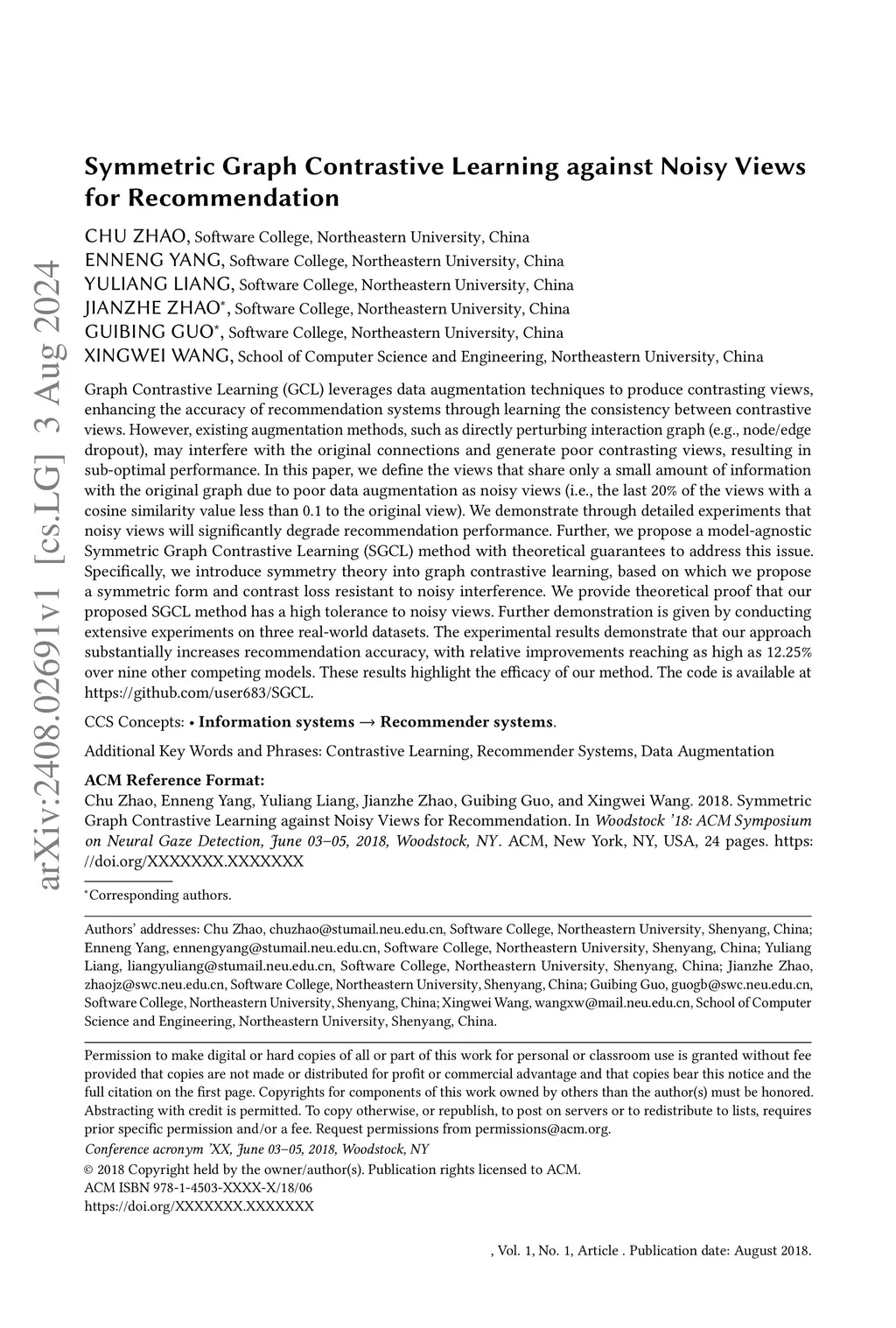 Graph Contrastive Learning (GCL) leverages data augmentation techniques to produce contrasting views, enhancing the accuracy of recommendation systems through learning the consistency between contrastive views. However, existing augmentation methods, such as directly perturbing interaction graph (e.g., node/edge dropout), may interfere with the original connections and generate poor contrasting views, resulting in sub-optimal performance. In this paper, we define the views that share only a small amount of information with the original graph due to poor data augmentation as noisy views (i.e., the last 20% of the views with a cosine similarity value less than 0.1 to the original view). We demonstrate through detailed experiments that noisy views will significantly degrade recommendation performance. Further, we propose a model-agnostic Symmetric Graph Contrastive Learning (SGCL) method with theoretical guarantees to address this issue. Specifically, we introduce symmetry theory into graph contrastive learning, based on which we propose a symmetric form and contrast loss resistant to noisy interference. We provide theoretical proof that our proposed SGCL method has a high tolerance to noisy views. Further demonstration is given by conducting extensive experiments on three real-world datasets. The experimental results demonstrate that our approach substantially increases recommendation accuracy, with relative improvements reaching as high as 12.25% over nine other competing models. These results highlight the efficacy of our method.