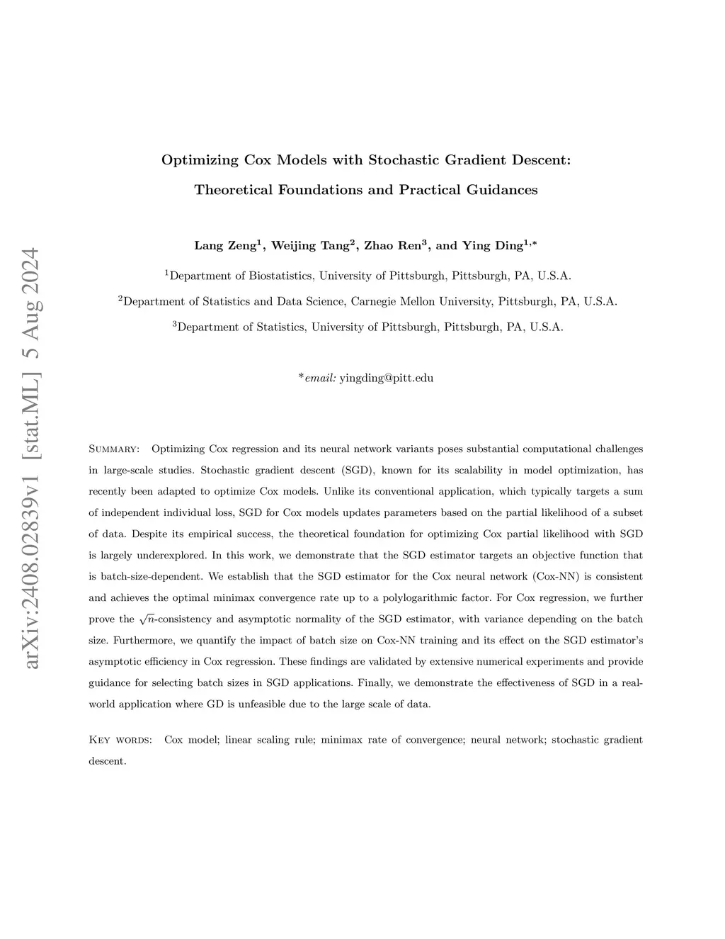 The stochastic gradient descent (SGD) algorithm has been widely used to optimize deep Cox neural network (Cox-NN) by updating model parameters using mini-batches of data. We show that SGD aims to optimize the average of mini-batch partial-likelihood, which is different from the standard partial-likelihood. This distinction requires developing new statistical properties for the global optimizer, namely, the mini-batch maximum partial-likelihood estimator (mb-MPLE). We establish that mb-MPLE for Cox-NN is consistent and achieves the optimal minimax convergence rate up to a polylogarithmic factor. For Cox regression with linear covariate effects, we further show that mb-MPLE is -consistent and asymptotically normal with asymptotic variance approaching the information lower bound as batch size increases, which is confirmed by simulation studies. Additionally, we offer practical guidance on using SGD, supported by theoretical analysis and numerical evidence. For Cox-NN, we demonstrate that the ratio of the learning rate to the batch size is critical in SGD dynamics, offering insight into hyperparameter tuning. For Cox regression, we characterize the iterative convergence of SGD, ensuring that the global optimizer, mb-MPLE, can be approximated with sufficiently many iterations. Finally, we demonstrate the effectiveness of mb-MPLE in a large-scale real-world application where the standard MPLE is intractable.