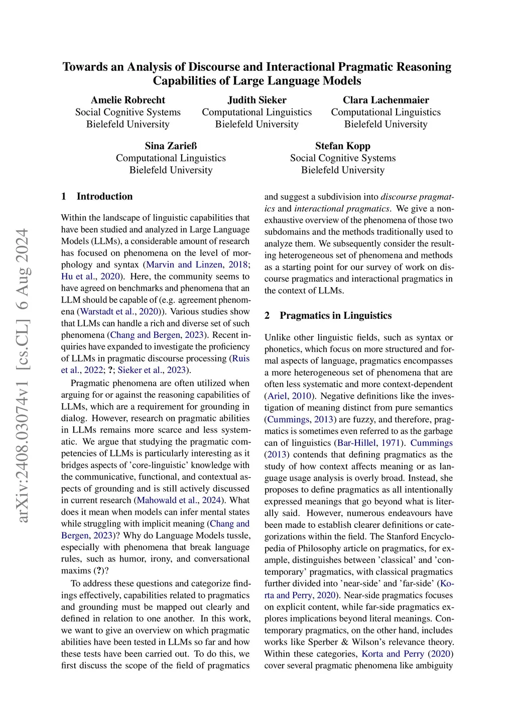 In this work, we want to give an overview on which pragmatic abilities have been tested in LLMs so far and how these tests have been carried out. To do this, we first discuss the scope of the field of pragmatics and suggest a subdivision into discourse pragmatics and interactional pragmatics. We give a non-exhaustive overview of the phenomena of those two subdomains and the methods traditionally used to analyze them. We subsequently consider the resulting heterogeneous set of phenomena and methods as a starting point for our survey of work on discourse pragmatics and interactional pragmatics in the context of LLMs.