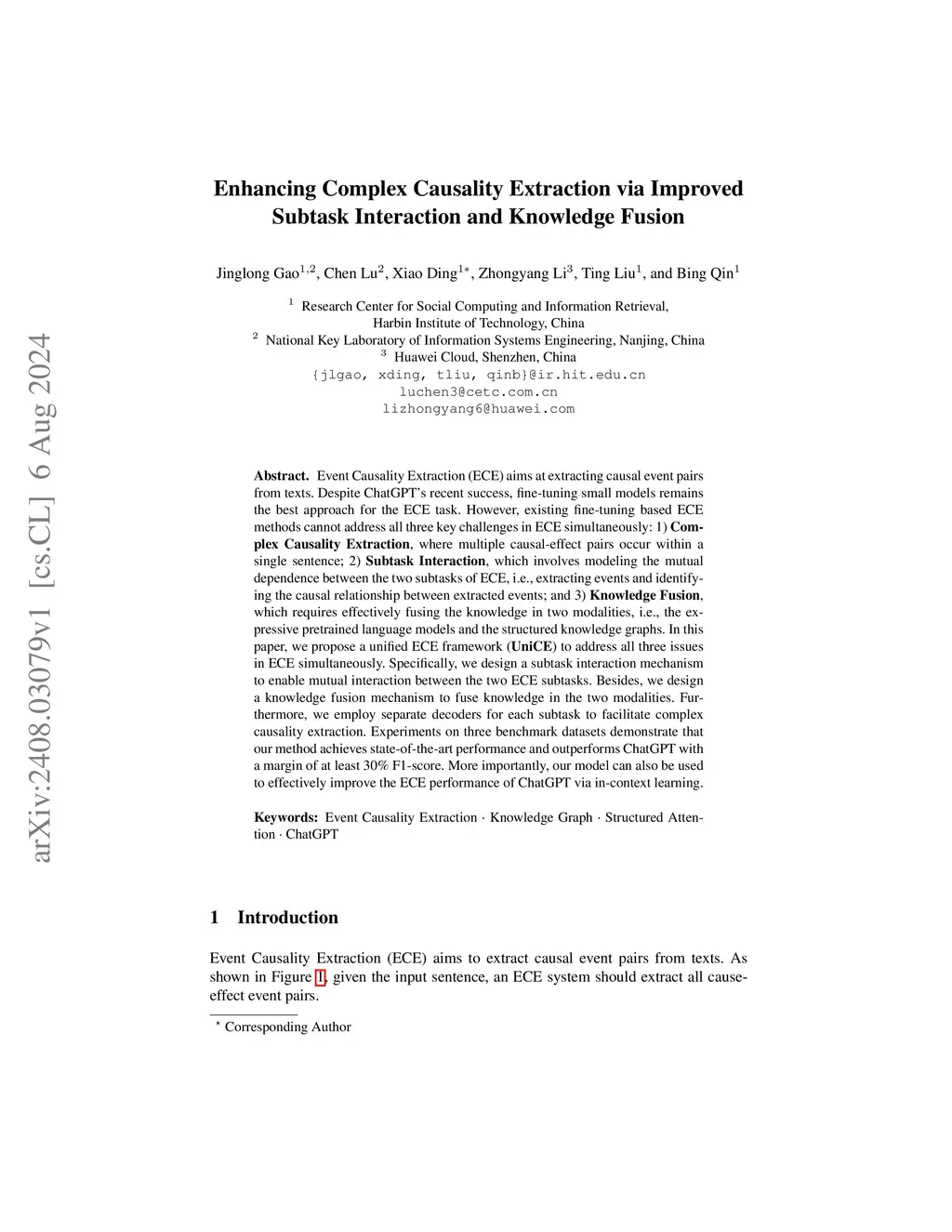 Event Causality Extraction (ECE) aims at extracting causal event pairs from texts. Despite ChatGPT's recent success, fine-tuning small models remains the best approach for the ECE task. However, existing fine-tuning based ECE methods cannot address all three key challenges in ECE simultaneously: 1) Complex Causality Extraction, where multiple causal-effect pairs occur within a single sentence; 2) Subtask~ Interaction, which involves modeling the mutual dependence between the two subtasks of ECE, i.e., extracting events and identifying the causal relationship between extracted events; and 3) Knowledge Fusion, which requires effectively fusing the knowledge in two modalities, i.e., the expressive pretrained language models and the structured knowledge graphs. In this paper, we propose a unified ECE framework (UniCE to address all three issues in ECE simultaneously. Specifically, we design a subtask interaction mechanism to enable mutual interaction between the two ECE subtasks. Besides, we design a knowledge fusion mechanism to fuse knowledge in the two modalities. Furthermore, we employ separate decoders for each subtask to facilitate complex causality extraction. Experiments on three benchmark datasets demonstrate that our method achieves state-of-the-art performance and outperforms ChatGPT with a margin of at least 30% F1-score. More importantly, our model can also be used to effectively improve the ECE performance of ChatGPT via in-context learning.