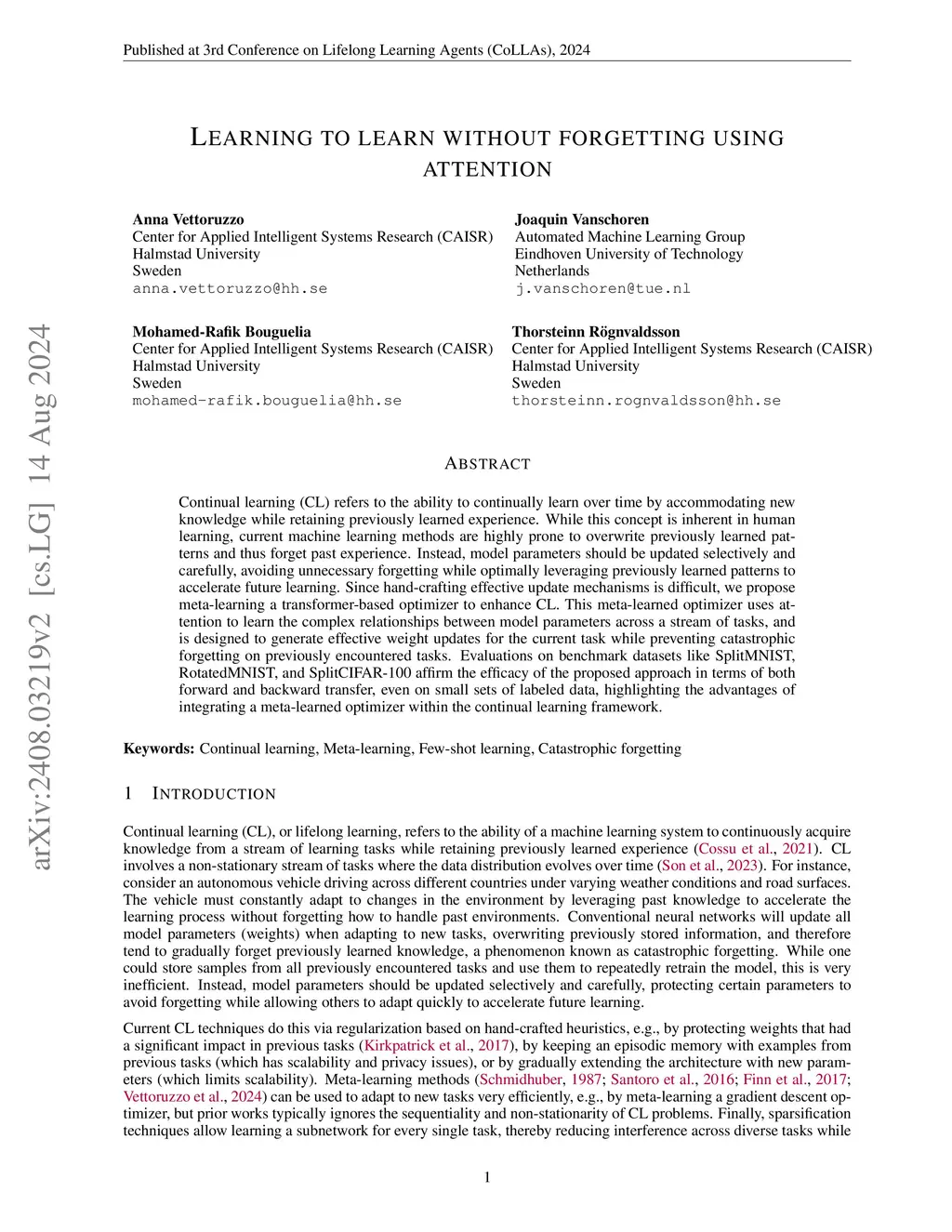 Continual learning (CL) refers to the ability to continually learn over time by accommodating new knowledge while retaining previously learned experience. While this concept is inherent in human learning, current machine learning methods are highly prone to overwrite previously learned patterns and thus forget past experience. Instead, model parameters should be updated selectively and carefully, avoiding unnecessary forgetting while optimally leveraging previously learned patterns to accelerate future learning. Since hand-crafting effective update mechanisms is difficult, we propose meta-learning a transformer-based optimizer to enhance CL. This meta-learned optimizer uses attention to learn the complex relationships between model parameters across a stream of tasks, and is designed to generate effective weight updates for the current task while preventing catastrophic forgetting on previously encountered tasks. Evaluations on benchmark datasets like SplitMNIST, RotatedMNIST, and SplitCIFAR-100 affirm the efficacy of the proposed approach in terms of both forward and backward transfer, even on small sets of labeled data, highlighting the advantages of integrating a meta-learned optimizer within the continual learning framework.