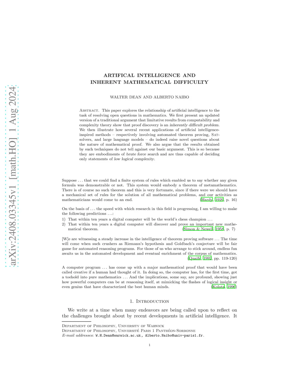 This paper explores the relationship of artificial intelligence to the task of resolving open questions in mathematics. We first present an updated version of a traditional argument that limitative results from computability and complexity theory show that proof discovery is an inherently difficult problem. We then illustrate how several recent applications of artificial intelligence-inspired methods -- respectively involving automated theorem proving, SAT-solvers, and large language models -- do indeed raise novel questions about the nature of mathematical proof. We also argue that the results obtained by such techniques do not tell against our basic argument. This is so because they are embodiments of brute force search and are thus capable of deciding only statements of low logical complexity.