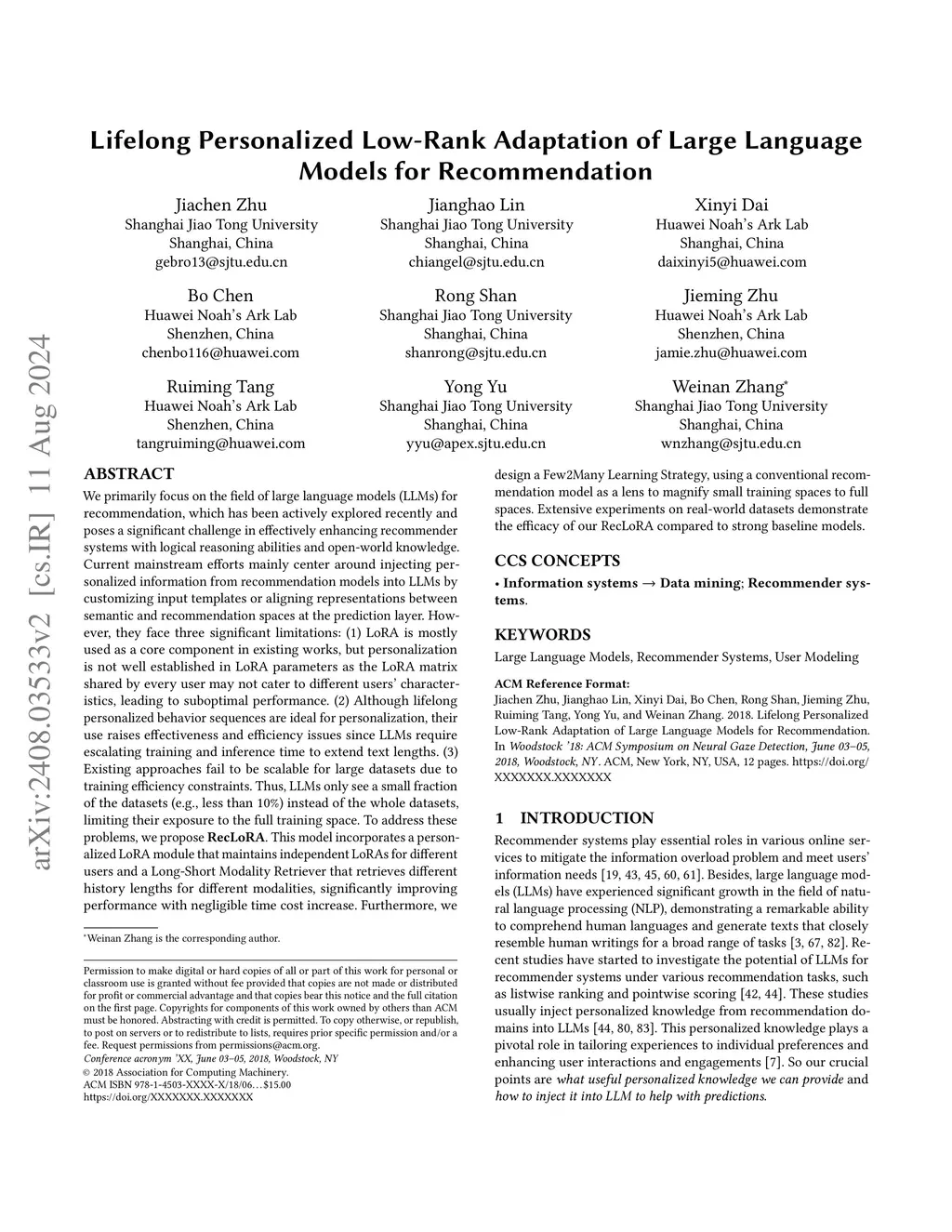 We primarily focus on the field of large language models (LLMs) for recommendation, which has been actively explored recently and poses a significant challenge in effectively enhancing recommender systems with logical reasoning abilities and open-world knowledge. Current mainstream efforts mainly center around injecting personalized information from recommendation models into LLMs by customizing input templates or aligning representations between semantic and recommendation spaces at the prediction layer. However, they face three significant limitations: (1) LoRA is mostly used as a core component in existing works, but personalization is not well established in LoRA parameters as the LoRA matrix shared by every user may not cater to different users' characteristics, leading to suboptimal performance. (2) Although lifelong personalized behavior sequences are ideal for personalization, their use raises effectiveness and efficiency issues since LLMs require escalating training and inference time to extend text lengths. (3) Existing approaches aren't scalable for large datasets due to training efficiency constraints. Thus, LLMs only see a small fraction of the datasets (e.g., less than 10%) instead of the whole datasets, limiting their exposure to the full training space. To address these problems, we propose RecLoRA. This model incorporates a Personalized LoRA module that maintains independent LoRAs for different users and a Long-Short Modality Retriever that retrieves different history lengths for different modalities, significantly improving performance while adding minimal time cost. Furthermore, we design a Few2Many Learning Strategy, using a conventional recommendation model as a lens to magnify small training spaces to full spaces. Extensive experiments on public datasets demonstrate the efficacy of our RecLoRA compared to existing baseline models.