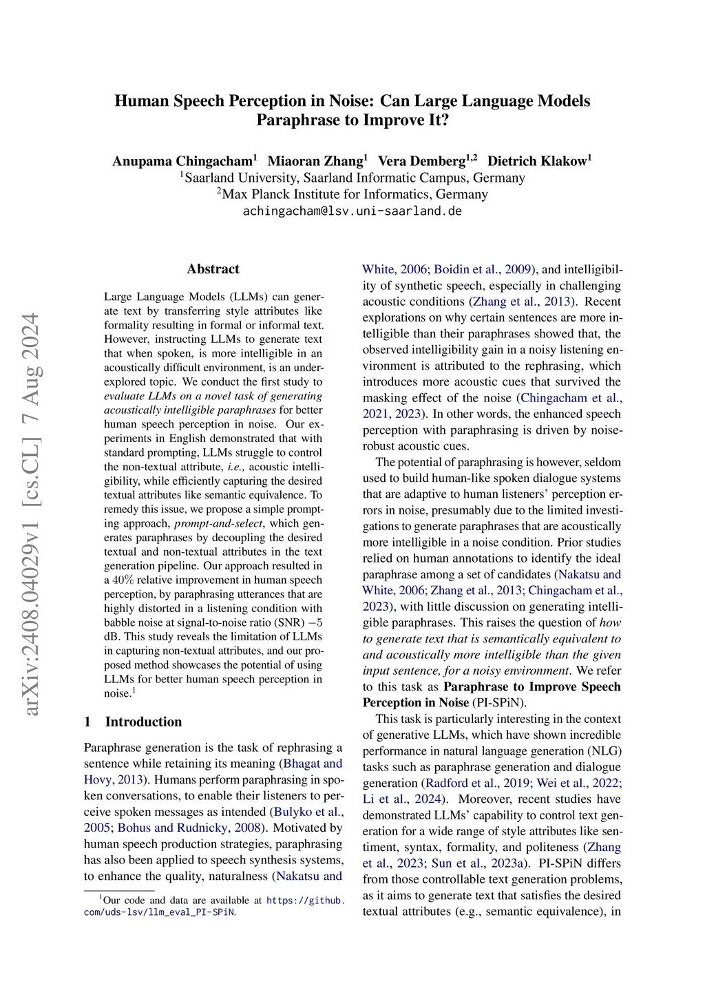 Large Language Models (LLMs) can generate text by transferring style attributes like formality resulting in formal or informal text. However, instructing LLMs to generate text that when spoken, is more intelligible in an acoustically difficult environment, is an under-explored topic. We conduct the first study to evaluate LLMs on a novel task of generating acoustically intelligible paraphrases for better human speech perception in noise. Our experiments in English demonstrated that with standard prompting, LLMs struggle to control the non-textual attribute, i.e., acoustic intelligibility, while efficiently capturing the desired textual attributes like semantic equivalence. To remedy this issue, we propose a simple prompting approach, prompt-and-select, which generates paraphrases by decoupling the desired textual and non-textual attributes in the text generation pipeline. Our approach resulted in a 40% relative improvement in human speech perception, by paraphrasing utterances that are highly distorted in a listening condition with babble noise at a signal-to-noise ratio (SNR) -5 dB. This study reveals the limitation of LLMs in capturing non-textual attributes, and our proposed method showcases the potential of using LLMs for better human speech perception in noise.