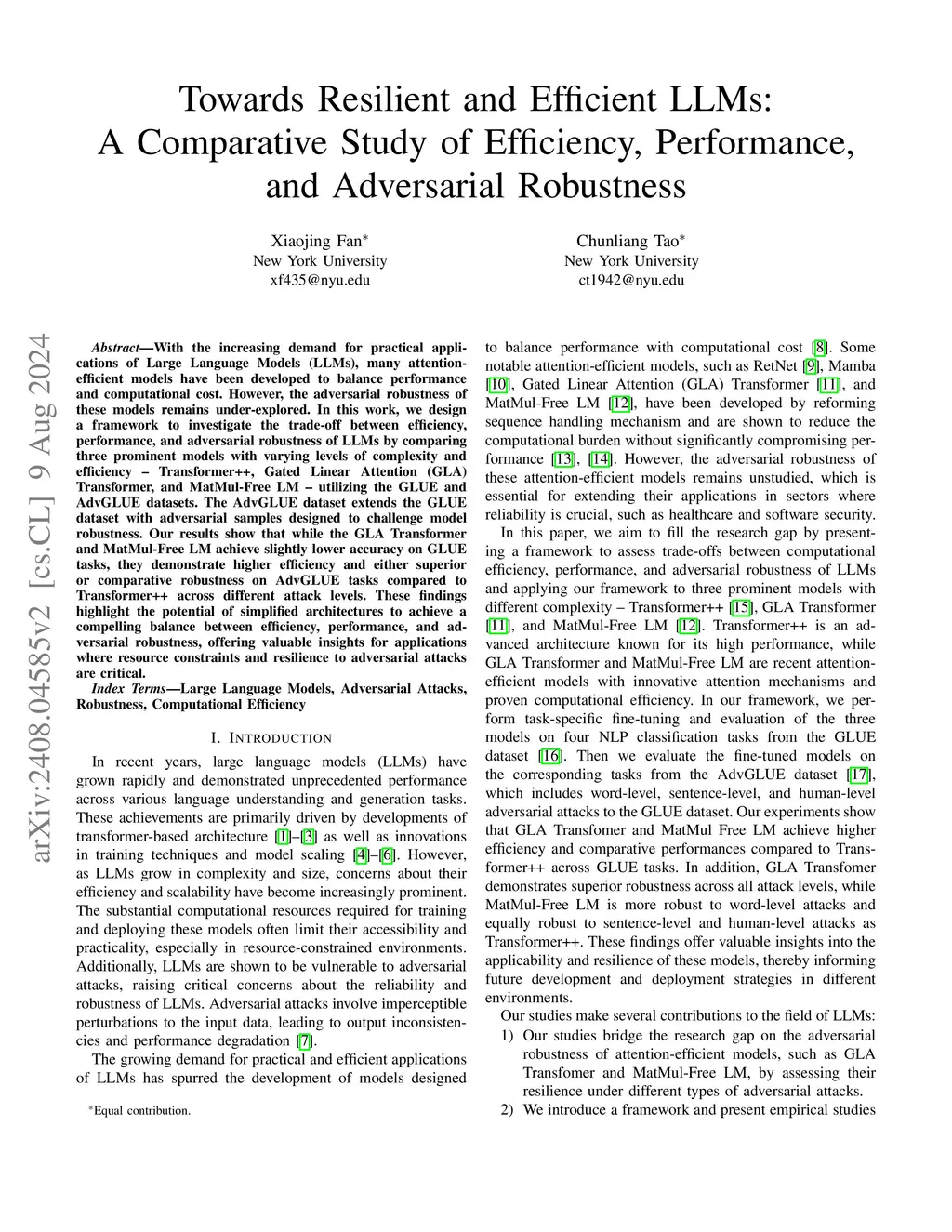 With the increasing demand for practical applications of Large Language Models (LLMs), many attention-efficient models have been developed to balance performance and computational cost. However, the adversarial robustness of these models remains under-explored. In this work, we design a framework to investigate the trade-off between efficiency, performance, and adversarial robustness of LLMs and conduct extensive experiments on three prominent models with varying levels of complexity and efficiency -- Transformer++, Gated Linear Attention (GLA) Transformer, and MatMul-Free LM -- utilizing the GLUE and AdvGLUE datasets. The AdvGLUE dataset extends the GLUE dataset with adversarial samples designed to challenge model robustness. Our results show that while the GLA Transformer and MatMul-Free LM achieve slightly lower accuracy on GLUE tasks, they demonstrate higher efficiency and either superior or comparative robustness on AdvGLUE tasks compared to Transformer++ across different attack levels. These findings highlight the potential of simplified architectures to achieve a compelling balance between efficiency, performance, and adversarial robustness, offering valuable insights for applications where resource constraints and resilience to adversarial attacks are critical.