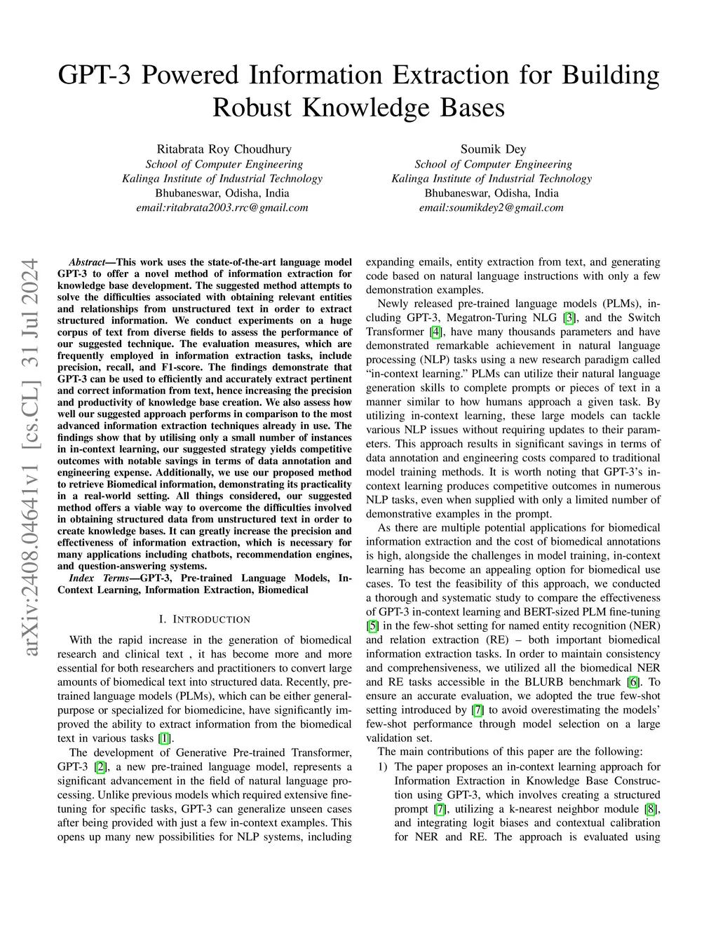 This work uses the state-of-the-art language model GPT-3 to offer a novel method of information extraction for knowledge base development. The suggested method attempts to solve the difficulties associated with obtaining relevant entities and relationships from unstructured text in order to extract structured information. We conduct experiments on a huge corpus of text from diverse fields to assess the performance of our suggested technique. The evaluation measures, which are frequently employed in information extraction tasks, include precision, recall, and F1-score. The findings demonstrate that GPT-3 can be used to efficiently and accurately extract pertinent and correct information from text, hence increasing the precision and productivity of knowledge base creation. We also assess how well our suggested approach performs in comparison to the most advanced information extraction techniques already in use. The findings show that by utilizing only a small number of instances in in-context learning, our suggested strategy yields competitive outcomes with notable savings in terms of data annotation and engineering expense. Additionally, we use our proposed method to retrieve Biomedical information, demonstrating its practicality in a real-world setting. All things considered, our suggested method offers a viable way to overcome the difficulties involved in obtaining structured data from unstructured text in order to create knowledge bases. It can greatly increase the precision and effectiveness of information extraction, which is necessary for many applications including chatbots, recommendation engines, and question-answering systems.