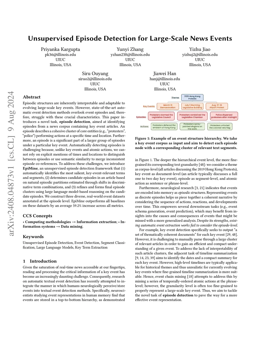 State-of-the-art automatic event detection struggles with interpretability and adaptability to evolving large-scale key events -- unlike episodic structures, which excel in these areas. Often overlooked, episodes represent cohesive clusters of core entities performing actions at a specific time and location; a partially ordered sequence of episodes can represent a key event. This paper introduces a novel task, episode detection, which identifies episodes within a news corpus of key event articles. Detecting episodes poses unique challenges, as they lack explicit temporal or locational markers and cannot be merged using semantic similarity alone. While large language models (LLMs) can aid with these reasoning difficulties, they suffer with long contexts typical of news corpora. To address these challenges, we introduce EpiMine, an unsupervised framework that identifies a key event's candidate episodes by leveraging natural episodic partitions in articles, estimated through shifts in discriminative term combinations. These candidate episodes are more cohesive and representative of true episodes, synergizing with LLMs to better interpret and refine them into final episodes. We apply EpiMine to our three diverse, real-world event datasets annotated at the episode level, where it achieves a 59.2% average gain across all metrics compared to baselines.