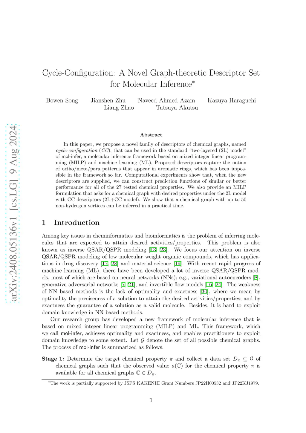 In this paper, we propose a novel family of descriptors of chemical graphs, named cycle-configuration (CC), that can be used in the standard "two-layered (2L) model" of mol-infer, a molecular inference framework based on mixed integer linear programming (MILP) and machine learning (ML). Proposed descriptors capture the notion of ortho/meta/para patterns that appear in aromatic rings, which has been impossible in the framework so far. Computational experiments show that, when the new descriptors are supplied, we can construct prediction functions of similar or better performance for all of the 27 tested chemical properties. We also provide an MILP formulation that asks for a chemical graph with desired properties under the 2L model with CC descriptors (2L+CC model). We show that a chemical graph with up to 50 non-hydrogen vertices can be inferred in a practical time.
