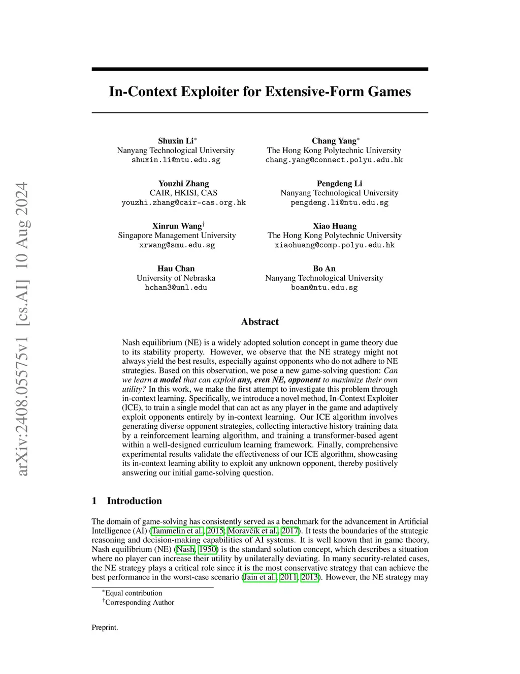 Nash equilibrium (NE) is a widely adopted solution concept in game theory due to its stability property. However, we observe that the NE strategy might not always yield the best results, especially against opponents who do not adhere to NE strategies. Based on this observation, we pose a new game-solving question: Can we learn a model that can exploit any, even NE, opponent to maximize their own utility? In this work, we make the first attempt to investigate this problem through in-context learning. Specifically, we introduce a novel method, In-Context Exploiter (ICE), to train a single model that can act as any player in the game and adaptively exploit opponents entirely by in-context learning. Our ICE algorithm involves generating diverse opponent strategies, collecting interactive history training data by a reinforcement learning algorithm, and training a transformer-based agent within a well-designed curriculum learning framework. Finally, comprehensive experimental results validate the effectiveness of our ICE algorithm, showcasing its in-context learning ability to exploit any unknown opponent, thereby positively answering our initial game-solving question.