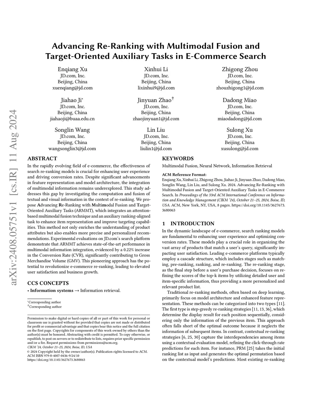 In the rapidly evolving field of e-commerce, the effectiveness of search re-ranking models is crucial for enhancing user experience and driving conversion rates. Despite significant advancements in feature representation and model architecture, the integration of multimodal information remains underexplored. This study addresses this gap by investigating the computation and fusion of textual and visual information in the context of re-ranking. We propose \textbf{A}dvancing \textbf{R}e-Ranking with \textbf{M}ulti\textbf{m}odal Fusion and \textbf{T}arget-Oriented Auxiliary Tasks (ARMMT), which integrates an attention-based multimodal fusion technique and an auxiliary ranking-aligned task to enhance item representation and improve targeting capabilities. This method not only enriches the understanding of product attributes but also enables more precise and personalized recommendations. Experimental evaluations on JD.com's search platform demonstrate that ARMMT achieves state-of-the-art performance in multimodal information integration, evidenced by a 0.22\% increase in the Conversion Rate (CVR), significantly contributing to Gross Merchandise Volume (GMV). This pioneering approach has the potential to revolutionize e-commerce re-ranking, leading to elevated user satisfaction and business growth.