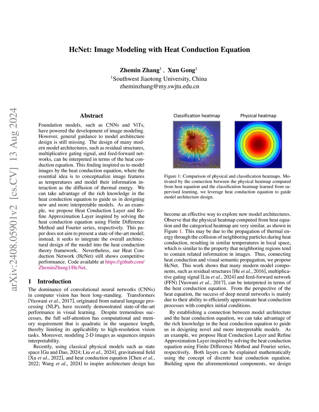 Foundation models, such as CNNs and ViTs, have powered the development of image representation learning. However, general guidance to model architecture design is still missing. Inspired by the connection between image representation learning and heat conduction, we model images by the heat conduction equation, where the essential idea is to conceptualize image features as temperatures and model their information interaction as the diffusion of thermal energy. Based on this idea, we find that many modern model architectures, such as residual structures, SE block, and feed-forward networks, can be interpreted from the perspective of the heat conduction equation. Therefore, we leverage the heat equation to design new and more interpretable models. As an example, we propose the Heat Conduction Layer and the Refinement Approximation Layer inspired by solving the heat conduction equation using Finite Difference Method and Fourier series, respectively. The main goal of this paper is to integrate the overall architectural design of neural networks into the theoretical framework of heat conduction. Nevertheless, our Heat Conduction Network (HcNet) still shows competitive performance, e.g., HcNet-T achieves 83.0% top-1 accuracy on ImageNet-1K while only requiring 28M parameters and 4.1G MACs. The code is publicly available at:this https URL.
