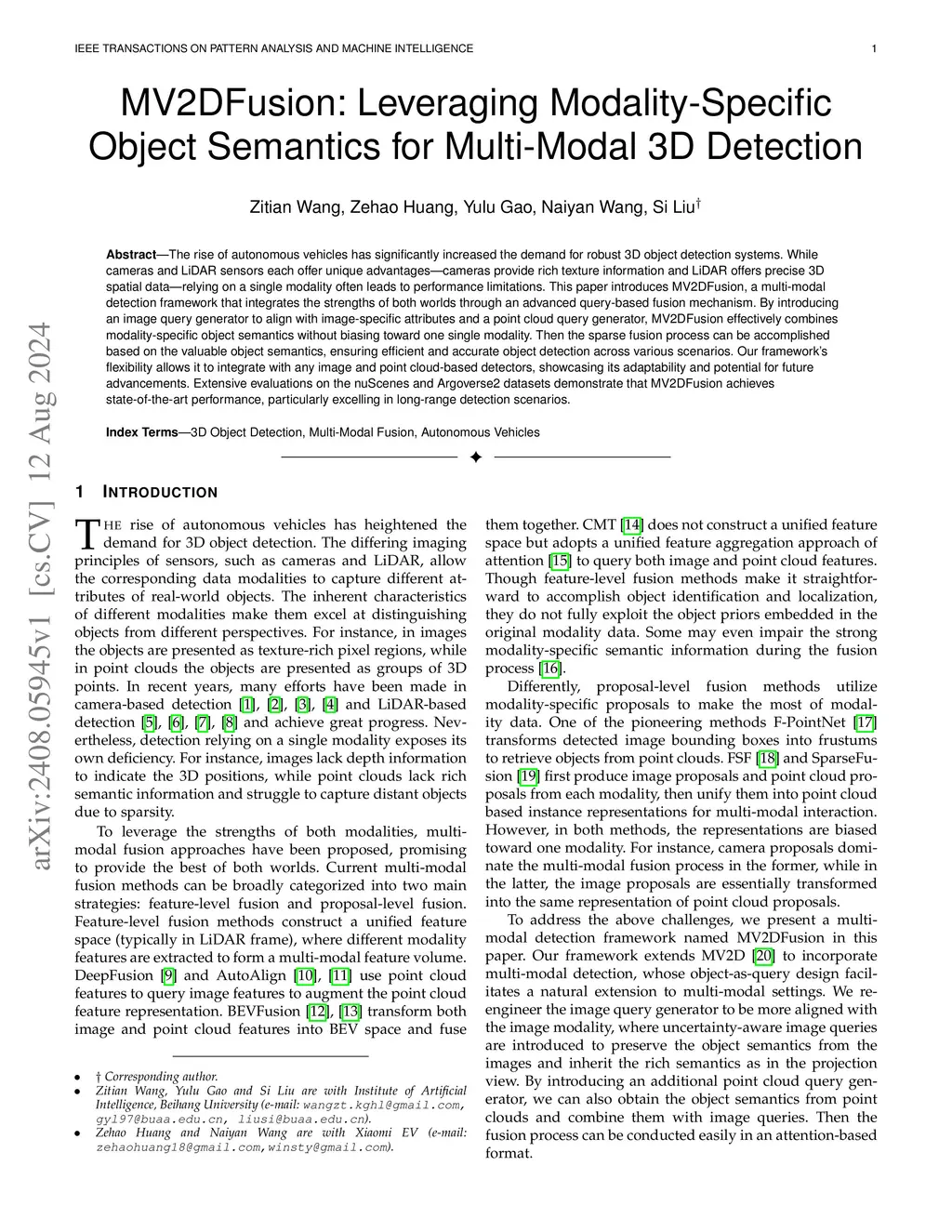The rise of autonomous vehicles has significantly increased the demand for robust 3D object detection systems. While cameras and LiDAR sensors each offer unique advantages--cameras provide rich texture information and LiDAR offers precise 3D spatial data--relying on a single modality often leads to performance limitations. This paper introduces MV2DFusion, a multi-modal detection framework that integrates the strengths of both worlds through an advanced query-based fusion mechanism. By introducing an image query generator to align with image-specific attributes and a point cloud query generator, MV2DFusion effectively combines modality-specific object semantics without biasing toward one single modality. Then the sparse fusion process can be accomplished based on the valuable object semantics, ensuring efficient and accurate object detection across various scenarios. Our framework's flexibility allows it to integrate with any image and point cloud-based detectors, showcasing its adaptability and potential for future advancements. Extensive evaluations on the nuScenes and Argoverse2 datasets demonstrate that MV2DFusion achieves state-of-the-art performance, particularly excelling in long-range detection scenarios.