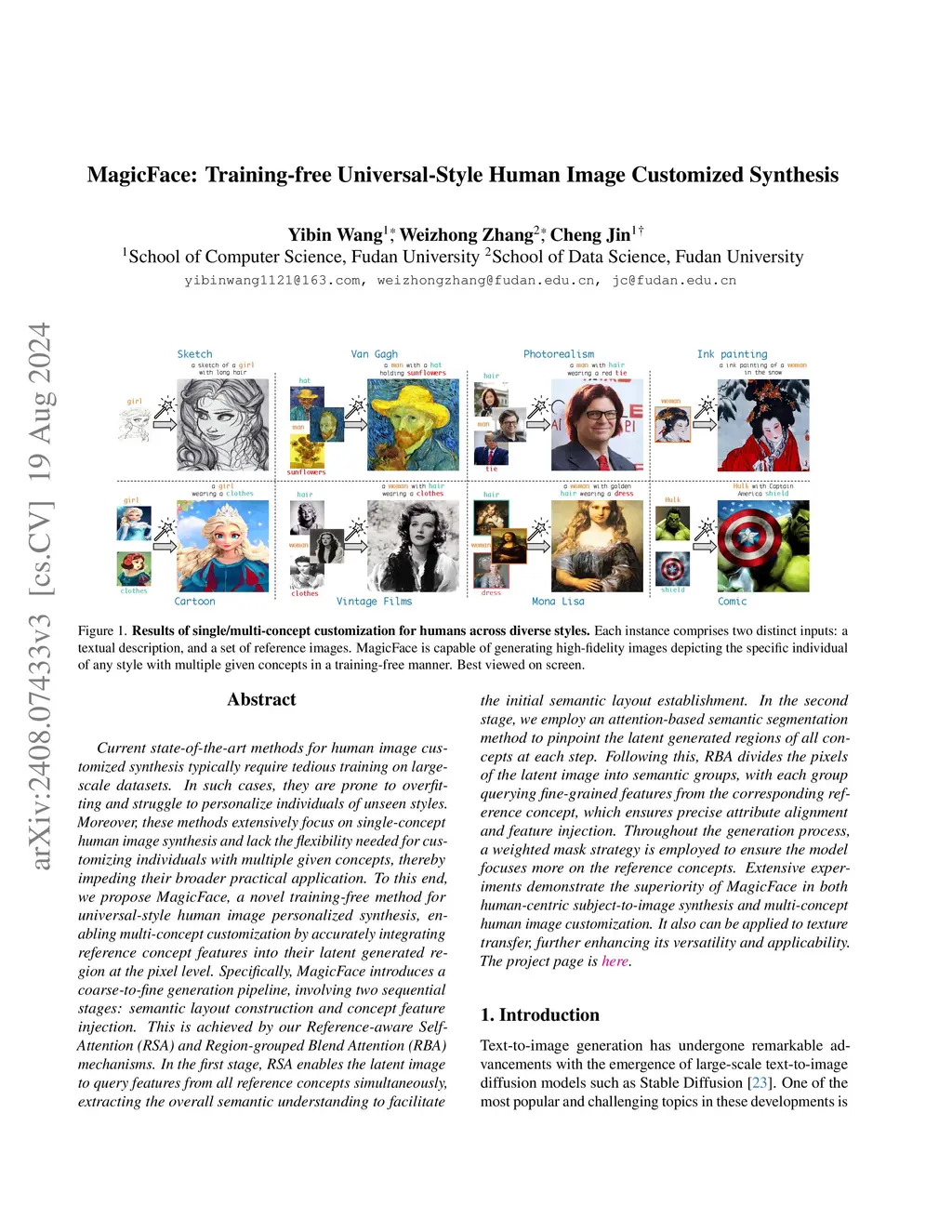 Current state-of-the-art methods for human image customized synthesis typically require tedious training on large-scale datasets. In such cases, they are prone to overfitting and struggle to personalize individuals of unseen styles. Moreover, these methods extensively focus on single-concept human image synthesis and lack the flexibility needed for customizing individuals with multiple given concepts, thereby impeding their broader practical application. To this end, we propose MagicFace, a novel training-free method for universal-style human image personalized synthesis, enabling multi-concept customization by accurately integrating reference concept features into their latent generated region at the pixel level. Specifically, MagicFace introduces a coarse-to-fine generation pipeline, involving two sequential stages: semantic layout construction and concept feature injection. This is achieved by our Reference-aware Self-Attention (RSA) and Region-grouped Blend Attention (RBA) mechanisms. In the first stage, RSA enables the latent image to query features from all reference concepts simultaneously, extracting the overall semantic understanding to facilitate the initial semantic layout establishment. In the second stage, we employ an attention-based semantic segmentation method to pinpoint the latent generated regions of all concepts at each step. Following this, RBA divides the pixels of the latent image into semantic groups, with each group querying fine-grained features from the corresponding reference concept, which ensures precise attribute alignment and feature injection. Throughout the generation process, a weighted mask strategy is employed to ensure the model focuses more on the reference concepts. Extensive experiments demonstrate the superiority of MagicFace in both human-centric subject-to-image synthesis and multi-concept human image customization.