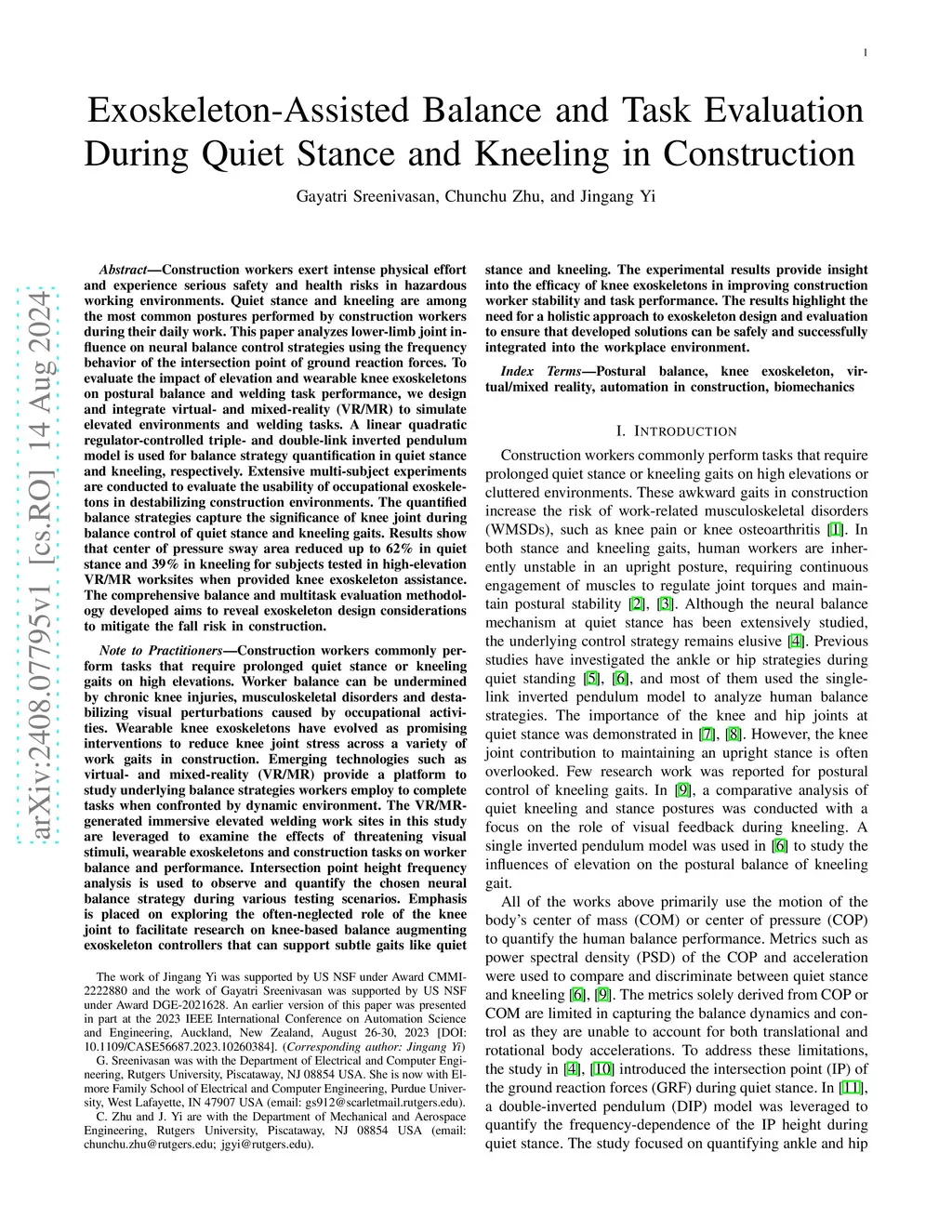 Construction workers exert intense physical effort and experience serious safety and health risks in hazardous working environments. Quiet stance and kneeling are among the most common postures performed by construction workers during their daily work. This paper analyzes lower-limb joint influence on neural balance control strategies using the frequency behavior of the intersection point of ground reaction forces. To evaluate the impact of elevation and wearable knee exoskeletons on postural balance and welding task performance, we design and integrate virtual- and mixed-reality (VR/MR) to simulate elevated environments and welding tasks. A linear quadratic regulator-controlled triple- and double-link inverted pendulum model is used for balance strategy quantification in quiet stance and kneeling, respectively. Extensive multi-subject experiments are conducted to evaluate the usability of occupational exoskeletons in destabilizing construction environments. The quantified balance strategies capture the significance of knee joint during balance control of quiet stance and kneeling gaits. Results show that center of pressure sway area reduced up to 62% in quiet stance and 39% in kneeling for subjects tested in high-elevation VR/MR worksites when provided knee exoskeleton assistance. The comprehensive balance and multitask evaluation methodology developed aims to reveal exoskeleton design considerations to mitigate the fall risk in construction.