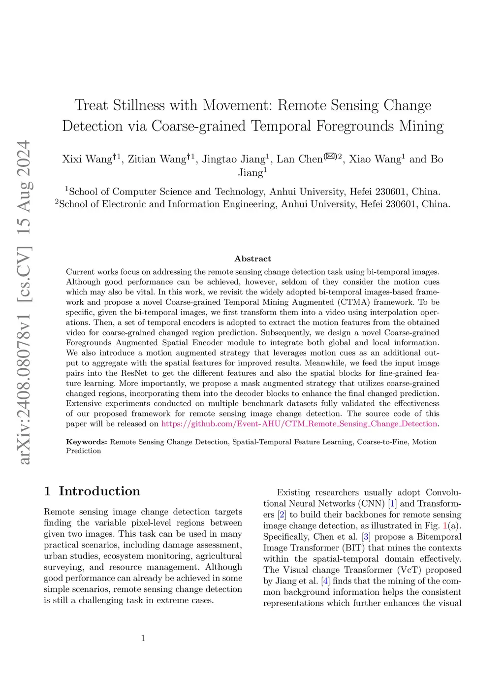 Current works focus on addressing the remote sensing change detection task using bi-temporal images. Although good performance can be achieved, however, seldom of they consider the motion cues which may also be vital. In this work, we revisit the widely adopted bi-temporal images-based framework and propose a novel Coarse-grained Temporal Mining Augmented (CTMA) framework. To be specific, given the bi-temporal images, we first transform them into a video using interpolation operations. Then, a set of temporal encoders is adopted to extract the motion features from the obtained video for coarse-grained changed region prediction. Subsequently, we design a novel Coarse-grained Foregrounds Augmented Spatial Encoder module to integrate both global and local information. We also introduce a motion augmented strategy that leverages motion cues as an additional output to aggregate with the spatial features for improved results. Meanwhile, we feed the input image pairs into the ResNet to get the different features and also the spatial blocks for fine-grained feature learning. More importantly, we propose a mask augmented strategy that utilizes coarse-grained changed regions, incorporating them into the decoder blocks to enhance the final changed prediction. Extensive experiments conducted on multiple benchmark datasets fully validated the effectiveness of our proposed framework for remote sensing image change detection. The source code of this paper will be released on https://github.com/Event-AHU/CTM_Remote_Sensing_Change_Detection
