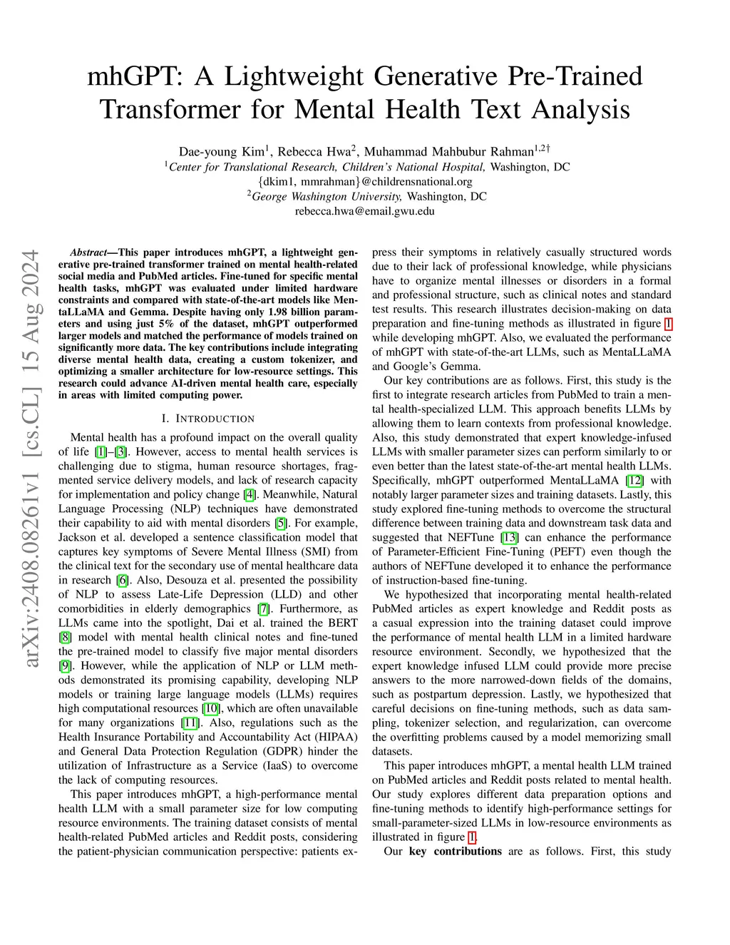 This paper introduces mhGPT, a lightweight generative pre-trained transformer trained on mental health-related social media and PubMed articles. Fine-tuned for specific mental health tasks, mhGPT was evaluated under limited hardware constraints and compared with state-of-the-art models like MentaLLaMA and Gemma. Despite having only 1.98 billion parameters and using just 5% of the dataset, mhGPT outperformed larger models and matched the performance of models trained on significantly more data. The key contributions include integrating diverse mental health data, creating a custom tokenizer, and optimizing a smaller architecture for low-resource settings. This research could advance AI-driven mental health care, especially in areas with limited computing power.