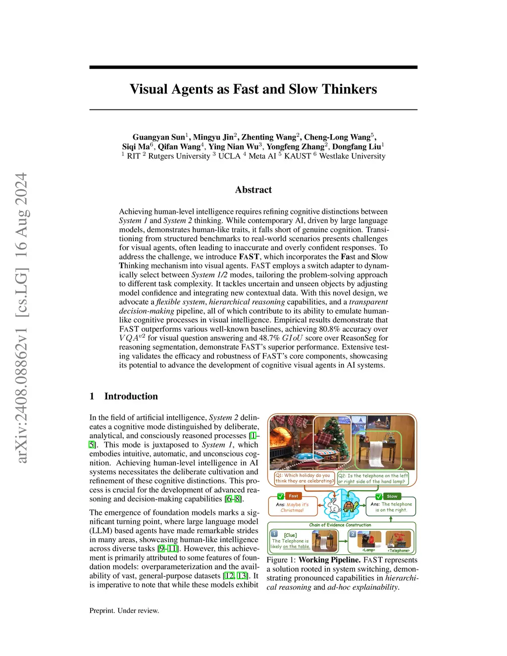 Achieving human-level intelligence requires refining cognitive distinctions between System 1 and System 2 thinking. While contemporary AI, driven by large language models, demonstrates human-like traits, it falls short of genuine cognition. Transitioning from structured benchmarks to real-world scenarios presents challenges for visual agents, often leading to inaccurate and overly confident responses. To address the challenge, we introduce FaST, which incorporates the Fast and Slow Thinking mechanism into visual agents. FaST employs a switch adapter to dynamically select between System 1/2 modes, tailoring the problem-solving approach to different task complexity. It tackles uncertain and unseen objects by adjusting model confidence and integrating new contextual data. With this novel design, we advocate a flexible system, hierarchical reasoning capabilities, and a transparent decision-making pipeline, all of which contribute to its ability to emulate human-like cognitive processes in visual intelligence. Empirical results demonstrate that FaST outperforms various well-known baselines, achieving 80.8% accuracy over VQA^{v2} for visual question answering and 48.7% GIoU score over ReasonSeg for reasoning segmentation, demonstrate FaST's superior performance. Extensive testing validates the efficacy and robustness of FaST's core components, showcasing its potential to advance the development of cognitive visual agents in AI systems. The code is available at ttps://github.com/GuangyanS/Sys2-LLaVA.