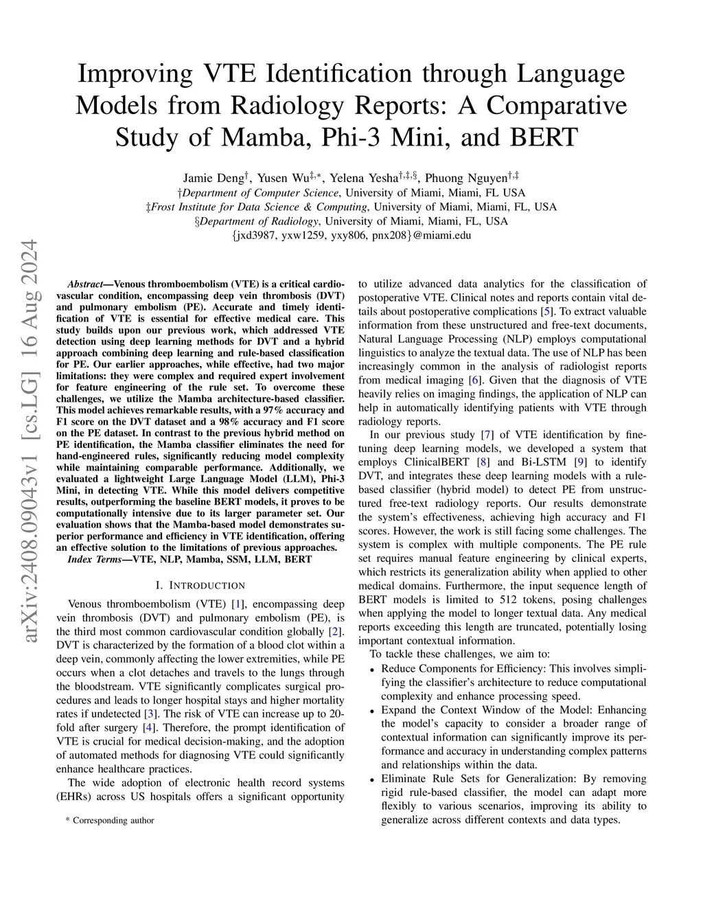 Venous thromboembolism (VTE) is a critical cardiovascular condition, encompassing deep vein thrombosis (DVT) and pulmonary embolism (PE). Accurate and timely identification of VTE is essential for effective medical care. This study builds upon our previous work, which addressed VTE detection using deep learning methods for DVT and a hybrid approach combining deep learning and rule-based classification for PE. Our earlier approaches, while effective, had two major limitations: they were complex and required expert involvement for feature engineering of the rule set. To overcome these challenges, we utilize the Mamba architecture-based classifier. This model achieves remarkable results, with a 97\% accuracy and F1 score on the DVT dataset and a 98\% accuracy and F1 score on the PE dataset. In contrast to the previous hybrid method on PE identification, the Mamba classifier eliminates the need for hand-engineered rules, significantly reducing model complexity while maintaining comparable performance. Additionally, we evaluated a lightweight Large Language Model (LLM), Phi-3 Mini, in detecting VTE. While this model delivers competitive results, outperforming the baseline BERT models, it proves to be computationally intensive due to its larger parameter set. Our evaluation shows that the Mamba-based model demonstrates superior performance and efficiency in VTE identification, offering an effective solution to the limitations of previous approaches.