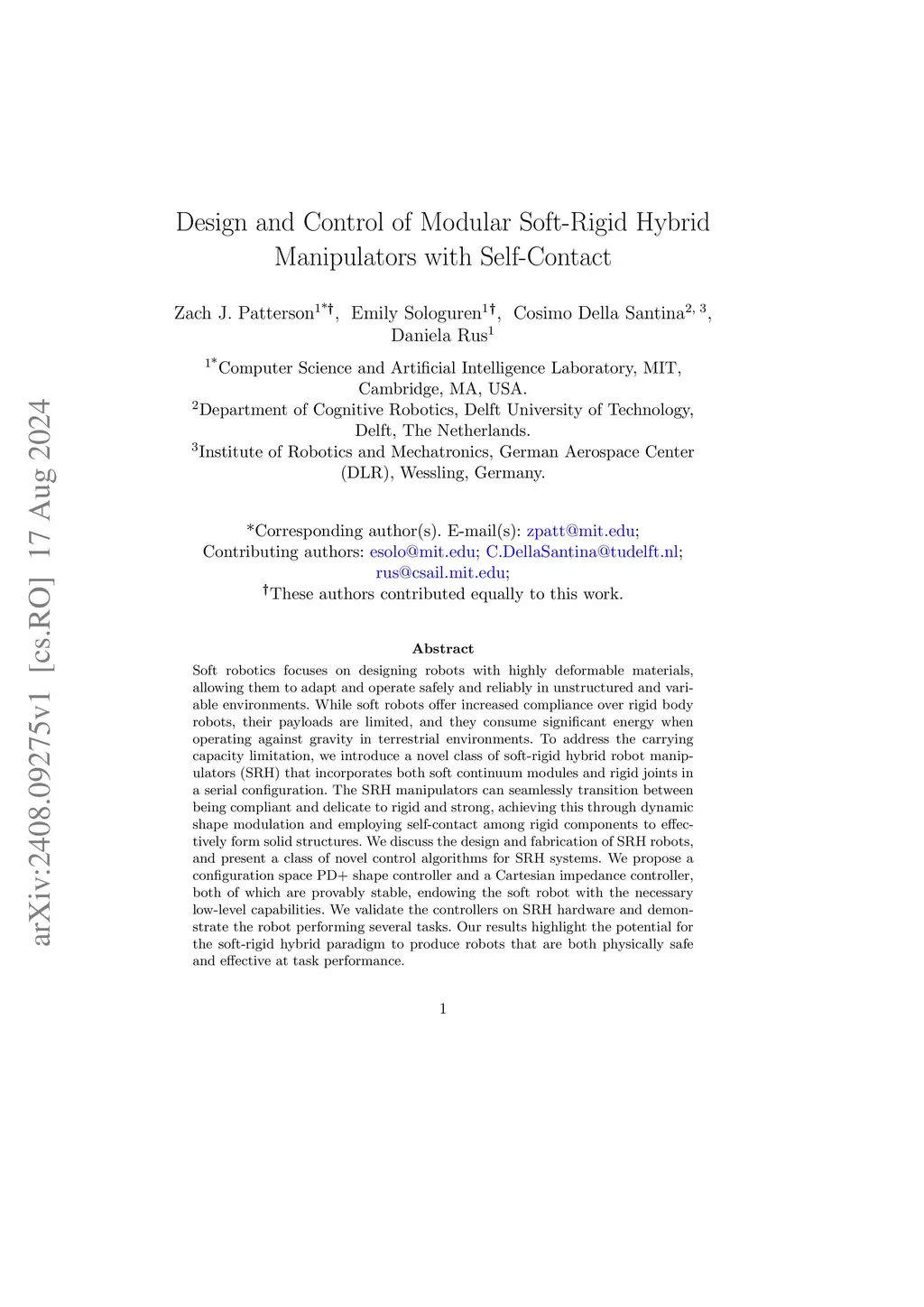 Soft robotics focuses on designing robots with highly deformable materials, allowing them to adapt and operate safely and reliably in unstructured and variable environments. While soft robots offer increased compliance over rigid body robots, their payloads are limited, and they consume significant energy when operating against gravity in terrestrial environments. To address the carrying capacity limitation, we introduce a novel class of soft-rigid hybrid robot manipulators (SRH) that incorporates both soft continuum modules and rigid joints in a serial configuration. The SRH manipulators can seamlessly transition between being compliant and delicate to rigid and strong, achieving this through dynamic shape modulation and employing self-contact among rigid components to effectively form solid structures. We discuss the design and fabrication of SRH robots, and present a class of novel control algorithms for SRH systems. We propose a configuration space PD+ shape controller and a Cartesian impedance controller, both of which are provably stable, endowing the soft robot with the necessary low-level capabilities. We validate the controllers on SRH hardware and demonstrate the robot performing several tasks. Our results highlight the potential for the soft-rigid hybrid paradigm to produce robots that are both physically safe and effective at task performance.