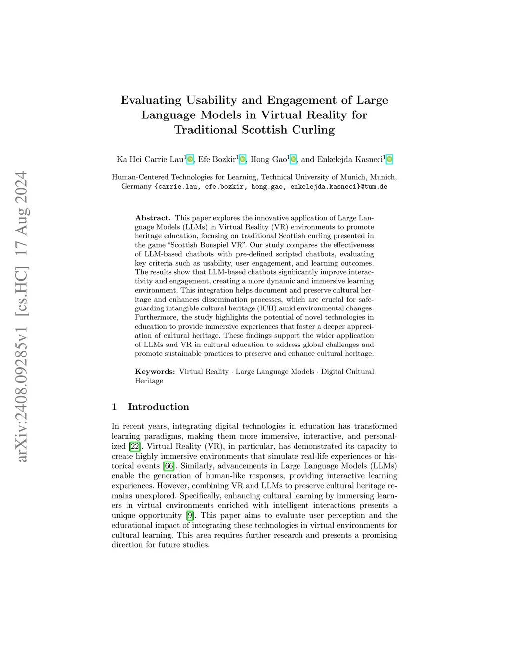 This paper explores the innovative application of Large Language Models (LLMs) in Virtual Reality (VR) environments to promote heritage education, focusing on traditional Scottish curling presented in the game ``Scottish Bonspiel VR''. Our study compares the effectiveness of LLM-based chatbots with pre-defined scripted chatbots, evaluating key criteria such as usability, user engagement, and learning outcomes. The results show that LLM-based chatbots significantly improve interactivity and engagement, creating a more dynamic and immersive learning environment. This integration helps document and preserve cultural heritage and enhances dissemination processes, which are crucial for safeguarding intangible cultural heritage (ICH) amid environmental changes. Furthermore, the study highlights the potential of novel technologies in education to provide immersive experiences that foster a deeper appreciation of cultural heritage. These findings support the wider application of LLMs and VR in cultural education to address global challenges and promote sustainable practices to preserve and enhance cultural heritage.