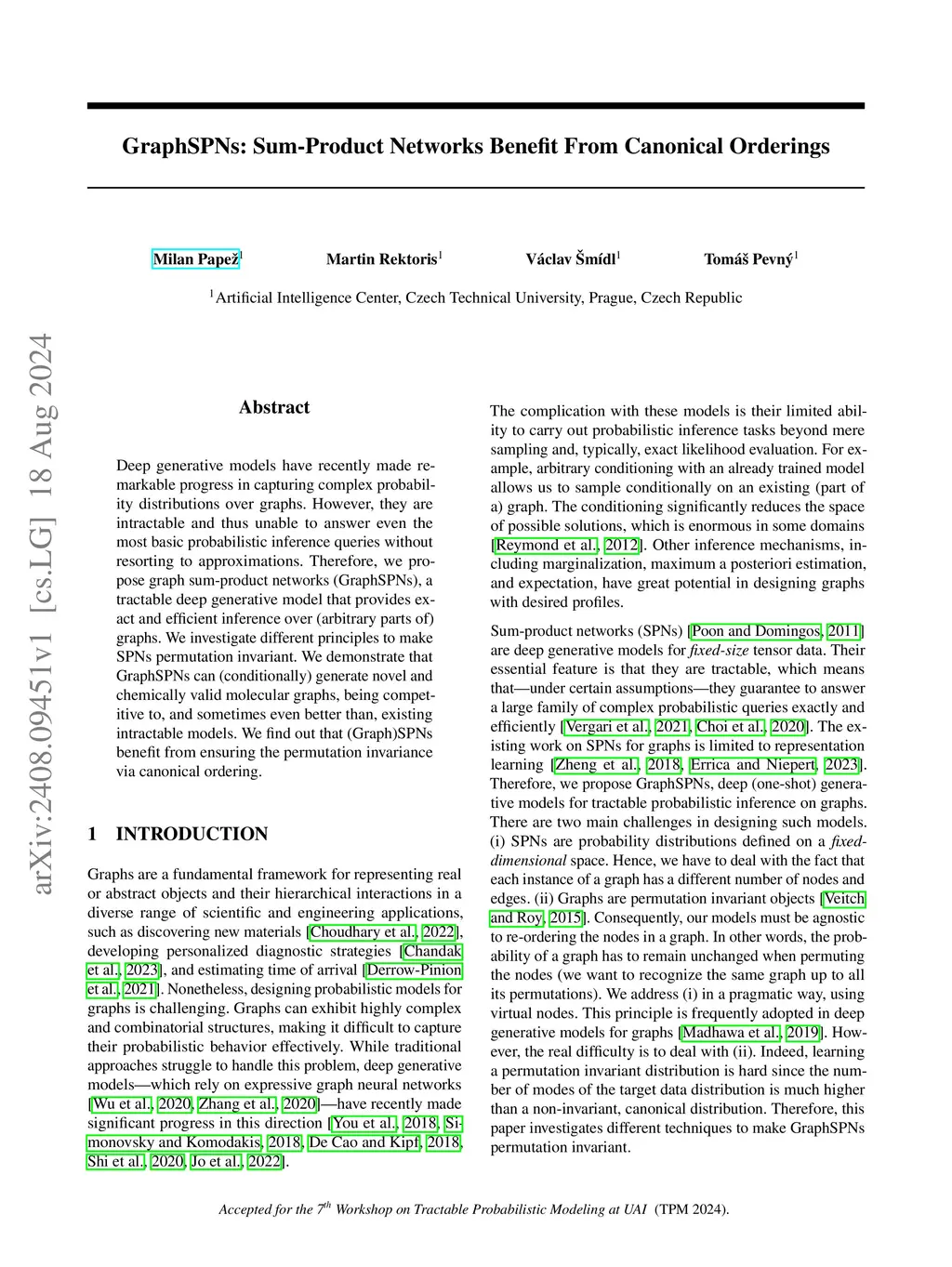Deep generative models have recently made a remarkable progress in capturing complex probability distributions over graphs. However, they are intractable and thus unable to answer even the most basic probabilistic inference queries without resorting to approximations. Therefore, we propose graph sum-product networks (GraphSPNs), a tractable deep generative model which provides exact and efficient inference over (arbitrary parts of) graphs. We investigate different principles to make SPNs permutation invariant. We demonstrate that GraphSPNs are able to (conditionally) generate novel and chemically valid molecular graphs, being competitive to, and sometimes even better than, existing intractable models. We find out that (Graph)SPNs benefit from ensuring the permutation invariance via canonical ordering.