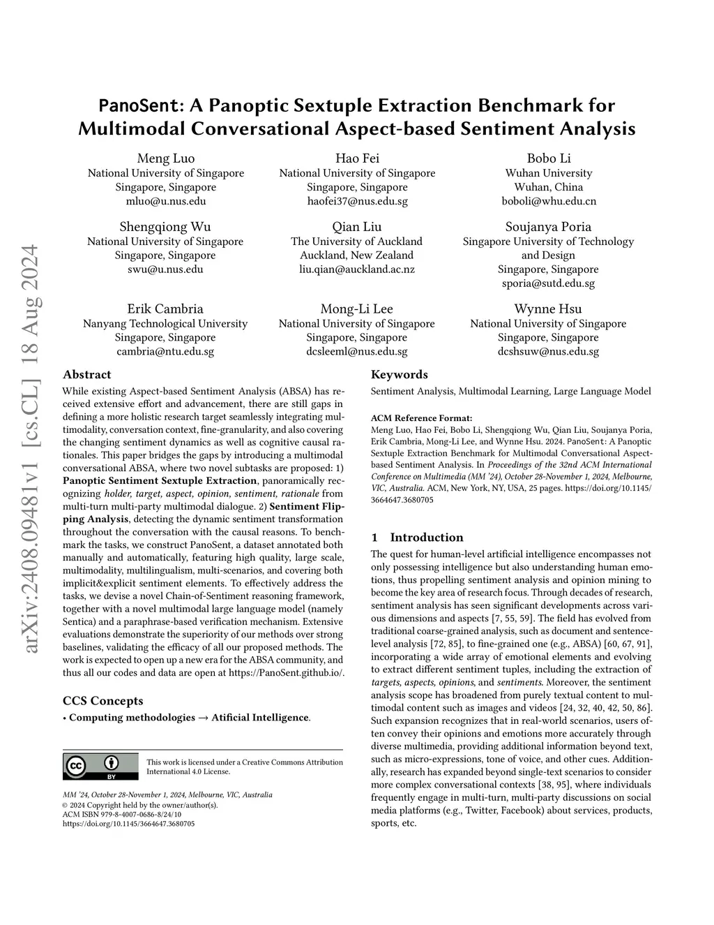 While existing Aspect-based Sentiment Analysis (ABSA) has received extensive effort and advancement, there are still gaps in defining a more holistic research target seamlessly integrating multimodality, conversation context, fine-granularity, and also covering the changing sentiment dynamics as well as cognitive causal rationales. This paper bridges the gaps by introducing a multimodal conversational ABSA, where two novel subtasks are proposed: 1) Panoptic Sentiment Sextuple Extraction, panoramically recognizing holder, target, aspect, opinion, sentiment, rationale from multi-turn multi-party multimodal dialogue. 2) Sentiment Flipping Analysis, detecting the dynamic sentiment transformation throughout the conversation with the causal reasons. To benchmark the tasks, we construct PanoSent, a dataset annotated both manually and automatically, featuring high quality, large scale, multimodality, multilingualism, multi-scenarios, and covering both implicit and explicit sentiment elements. To effectively address the tasks, we devise a novel Chain-of-Sentiment reasoning framework, together with a novel multimodal large language model (namely Sentica) and a paraphrase-based verification mechanism. Extensive evaluations demonstrate the superiority of our methods over strong baselines, validating the efficacy of all our proposed methods. The work is expected to open up a new era for the ABSA community, and thus all our codes and data are open at https://PanoSent.github.io/