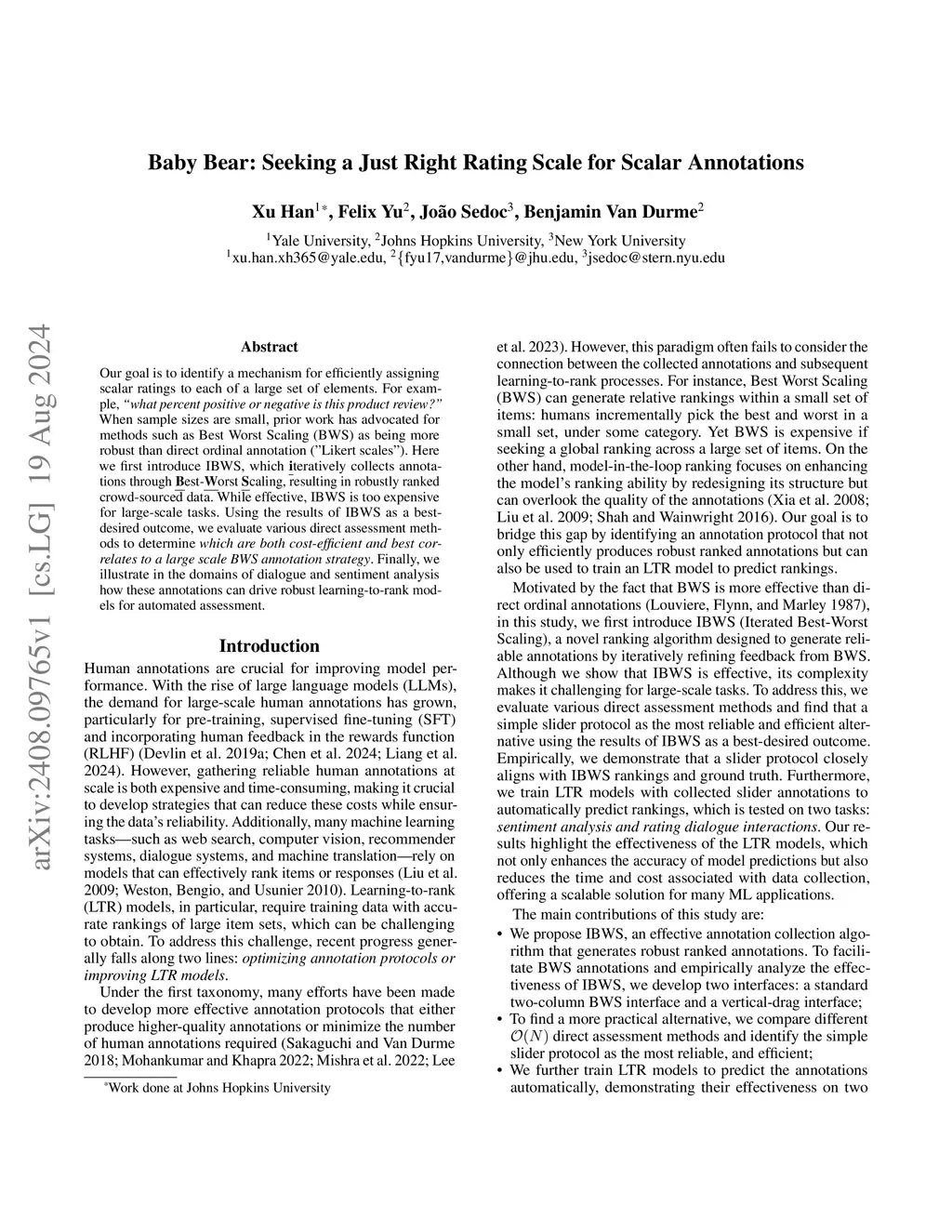 Our goal is a mechanism for efficiently assigning scalar ratings to each of a large set of elements. For example, "what percent positive or negative is this product review?" When sample sizes are small, prior work has advocated for methods such as Best Worst Scaling (BWS) as being more robust than direct ordinal annotation ("Likert scales"). Here we first introduce IBWS, which iteratively collects annotations through Best-Worst Scaling, resulting in robustly ranked crowd-sourced data. While effective, IBWS is too expensive for large-scale tasks. Using the results of IBWS as a best-desired outcome, we evaluate various direct assessment methods to determine what is both cost-efficient and best correlating to a large scale BWS annotation strategy. Finally, we illustrate in the domains of dialogue and sentiment how these annotations can support robust learning-to-rank models.
