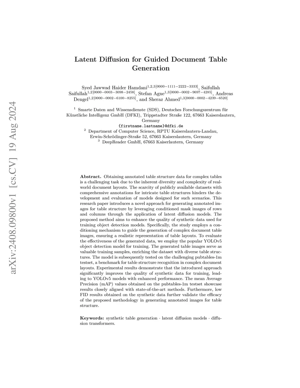 Obtaining annotated table structure data for complex tables is a challenging task due to the inherent diversity and complexity of real-world document layouts. The scarcity of publicly available datasets with comprehensive annotations for intricate table structures hinders the development and evaluation of models designed for such scenarios. This research paper introduces a novel approach for generating annotated images for table structure by leveraging conditioned mask images of rows and columns through the application of latent diffusion models. The proposed method aims to enhance the quality of synthetic data used for training object detection models. Specifically, the study employs a conditioning mechanism to guide the generation of complex document table images, ensuring a realistic representation of table layouts. To evaluate the effectiveness of the generated data, we employ the popular YOLOv5 object detection model for training. The generated table images serve as valuable training samples, enriching the dataset with diverse table structures. The model is subsequently tested on the challenging pubtables-1m testset, a benchmark for table structure recognition in complex document layouts. Experimental results demonstrate that the introduced approach significantly improves the quality of synthetic data for training, leading to YOLOv5 models with enhanced performance. The mean Average Precision (mAP) values obtained on the pubtables-1m testset showcase results closely aligned with state-of-the-art methods. Furthermore, low FID results obtained on the synthetic data further validate the efficacy of the proposed methodology in generating annotated images for table structure.