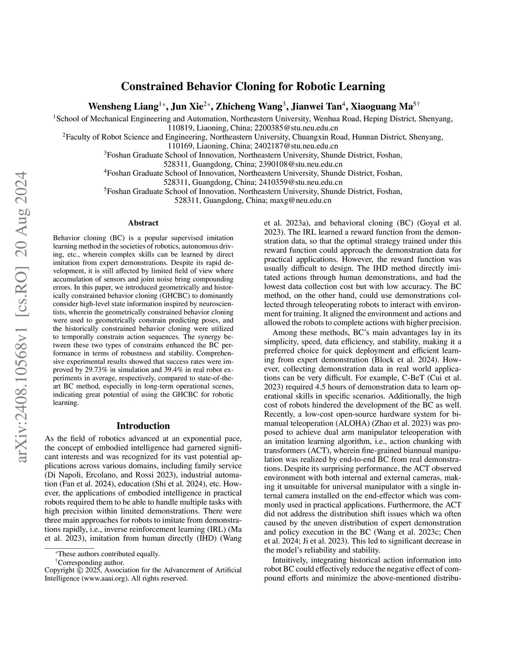Behavior cloning (BC) is a popular supervised imitation learning method in the societies of robotics, autonomous driving, etc., wherein complex skills can be learned by direct imitation from expert demonstrations. Despite its rapid development, it is still affected by limited field of view where accumulation of sensors and joint noise bring compounding errors. In this paper, we introduced geometrically and historically constrained behavior cloning (GHCBC) to dominantly consider high-level state information inspired by neuroscientists, wherein the geometrically constrained behavior cloning were used to geometrically constrain predicting poses, and the historically constrained behavior cloning were utilized to temporally constrain action sequences. The synergy between these two types of constrains enhanced the BC performance in terms of robustness and stability. Comprehensive experimental results showed that success rates were improved by 29.73% in simulation and 39.4% in real robot experiments in average, respectively, compared to state-of-the-art BC method, especially in long-term operational scenes, indicating great potential of using the GHCBC for robotic learning.