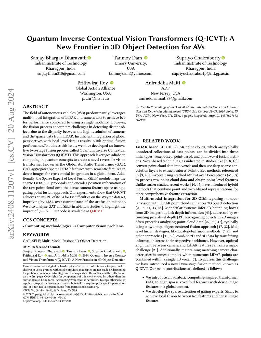 The field of autonomous vehicles (AVs) predominantly leverages multi-modal integration of LiDAR and camera data to achieve better performance compared to using a single modality. However, the fusion process encounters challenges in detecting distant objects due to the disparity between the high resolution of cameras and the sparse data from LiDAR. Insufficient integration of global perspectives with local-level details results in sub-optimal fusion performance.To address this issue, we have developed an innovative two-stage fusion process called Quantum Inverse Contextual Vision Transformers (Q-ICVT). This approach leverages adiabatic computing in quantum concepts to create a novel reversible vision transformer known as the Global Adiabatic Transformer (GAT). GAT aggregates sparse LiDAR features with semantic features in dense images for cross-modal integration in a global form. Additionally, the Sparse Expert of Local Fusion (SELF) module maps the sparse LiDAR 3D proposals and encodes position information of the raw point cloud onto the dense camera feature space using a gating point fusion approach. Our experiments show that Q-ICVT achieves an mAPH of 82.54 for L2 difficulties on the Waymo dataset, improving by 1.88% over current state-of-the-art fusion methods. We also analyze GAT and SELF in ablation studies to highlight the impact of Q-ICVT. Our code is available at https://github.com/sanjay-810/Qicvt Q-ICVT