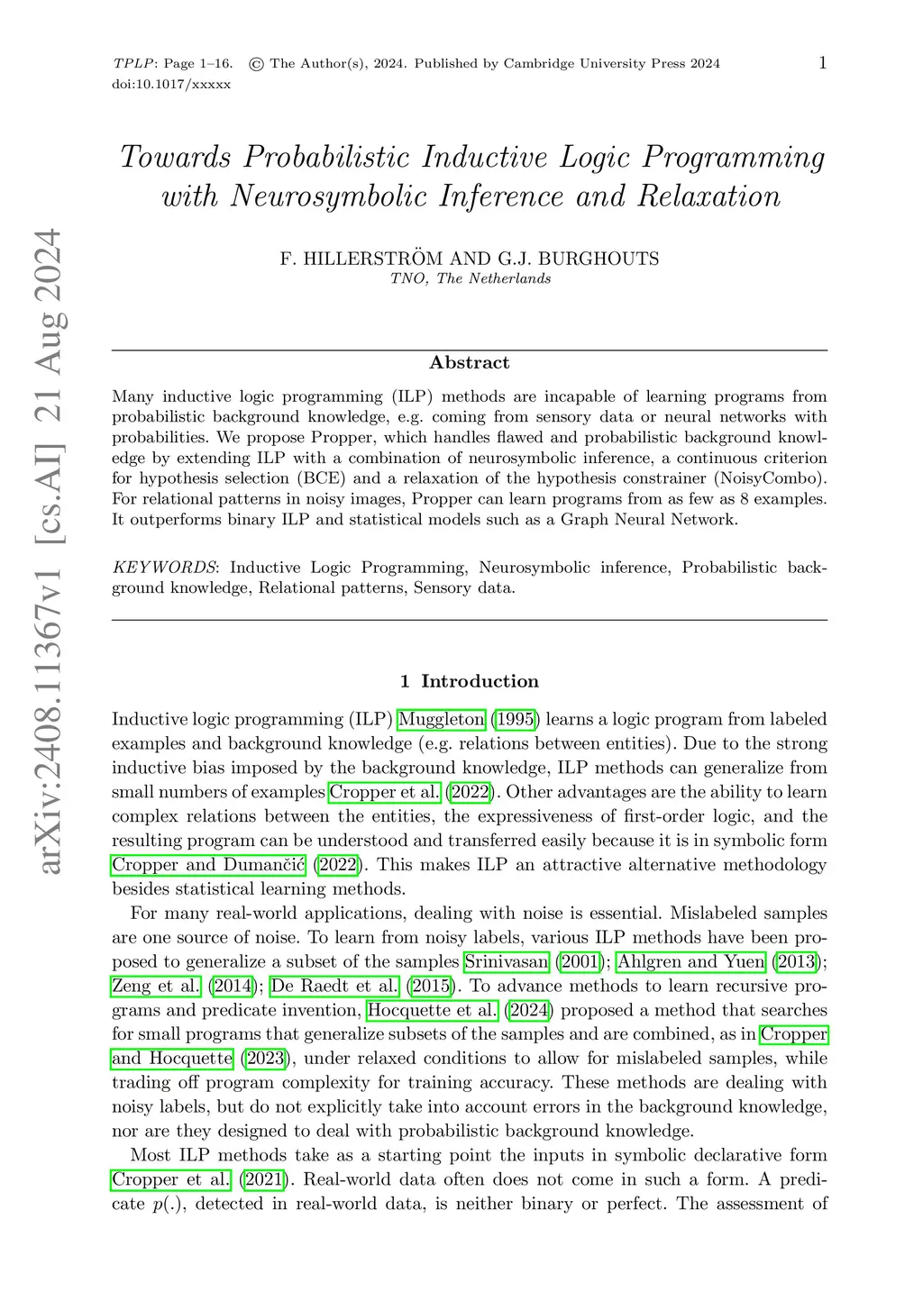 Many inductive logic programming (ILP) methods are incapable of learning programs from probabilistic background knowledge, e.g. coming from sensory data or neural networks with probabilities. We propose Propper, which handles flawed and probabilistic background knowledge by extending ILP with a combination of neurosymbolic inference, a continuous criterion for hypothesis selection (BCE) and a relaxation of the hypothesis constrainer (NoisyCombo). For relational patterns in noisy images, Propper can learn programs from as few as 8 examples. It outperforms binary ILP and statistical models such as a Graph Neural Network.