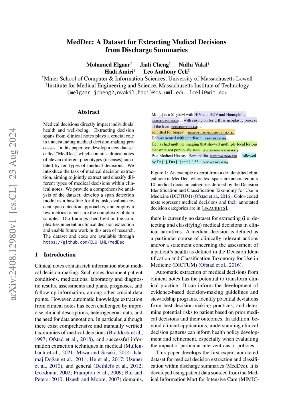 MedDec: A Dataset for Extracting Medical Decisions from Discharge