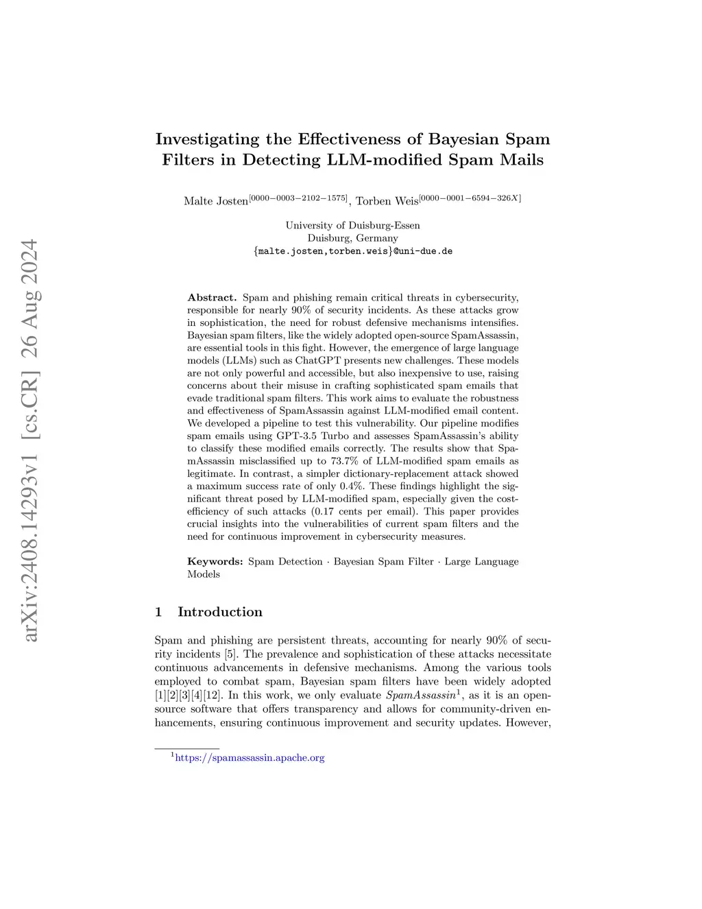 Spam and phishing remain critical threats in cybersecurity, responsible for nearly 90% of security incidents. As these attacks grow in sophistication, the need for robust defensive mechanisms intensifies. Bayesian spam filters, like the widely adopted open-source SpamAssassin, are essential tools in this fight. However, the emergence of large language models (LLMs) such as ChatGPT presents new challenges. These models are not only powerful and accessible, but also inexpensive to use, raising concerns about their misuse in crafting sophisticated spam emails that evade traditional spam filters. This work aims to evaluate the robustness and effectiveness of SpamAssassin against LLM-modified email content. We developed a pipeline to test this vulnerability. Our pipeline modifies spam emails using GPT-3.5 Turbo and assesses SpamAssassin's ability to classify these modified emails correctly. The results show that SpamAssassin misclassified up to 73.7% of LLM-modified spam emails as legitimate. In contrast, a simpler dictionary-replacement attack showed a maximum success rate of only 0.4%. These findings highlight the significant threat posed by LLM-modified spam, especially given the cost-efficiency of such attacks (0.17 cents per email). This paper provides crucial insights into the vulnerabilities of current spam filters and the need for continuous improvement in cybersecurity measures.