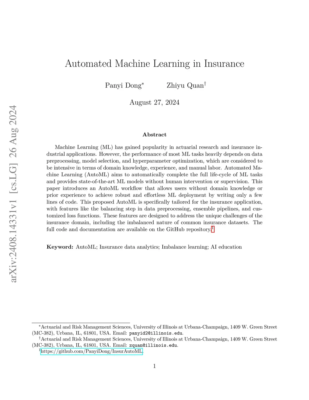 Machine Learning (ML) has gained popularity in actuarial research and insurance industrial applications. However, the performance of most ML tasks heavily depends on data preprocessing, model selection, and hyperparameter optimization, which are considered to be intensive in terms of domain knowledge, experience, and manual labor. Automated Machine Learning (AutoML) aims to automatically complete the full life-cycle of ML tasks and provides state-of-the-art ML models without human intervention or supervision. This paper introduces an AutoML workflow that allows users without domain knowledge or prior experience to achieve robust and effortless ML deployment by writing only a few lines of code. This proposed AutoML is specifically tailored for the insurance application, with features like the balancing step in data preprocessing, ensemble pipelines, and customized loss functions. These features are designed to address the unique challenges of the insurance domain, including the imbalanced nature of common insurance datasets. The full code and documentation are available on the GitHub repository. (https://github.com/PanyiDong/InsurAutoML)