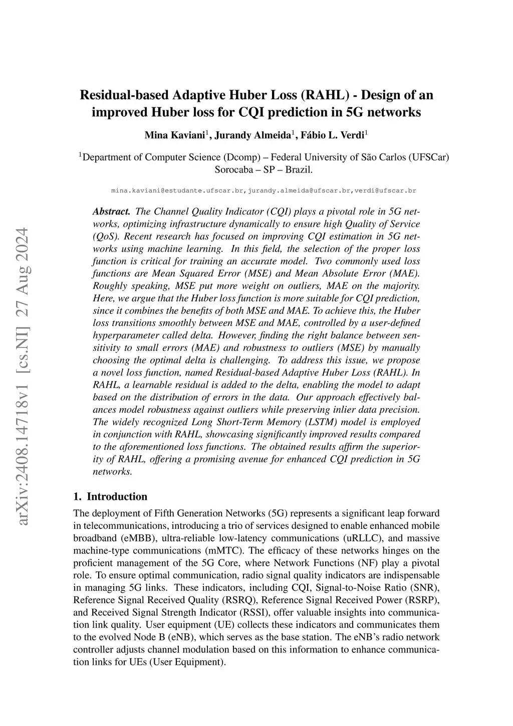 The Channel Quality Indicator (CQI) plays a pivotal role in 5G networks, optimizing infrastructure dynamically to ensure high Quality of Service (QoS). Recent research has focused on improving CQI estimation in 5G networks using machine learning. In this field, the selection of the proper loss function is critical for training an accurate model. Two commonly used loss functions are Mean Squared Error (MSE) and Mean Absolute Error (MAE). Roughly speaking, MSE put more weight on outliers, MAE on the majority. Here, we argue that the Huber loss function is more suitable for CQI prediction, since it combines the benefits of both MSE and MAE. To achieve this, the Huber loss transitions smoothly between MSE and MAE, controlled by a user-defined hyperparameter called delta. However, finding the right balance between sensitivity to small errors (MAE) and robustness to outliers (MSE) by manually choosing the optimal delta is challenging. To address this issue, we propose a novel loss function, named Residual-based Adaptive Huber Loss (RAHL). In RAHL, a learnable residual is added to the delta, enabling the model to adapt based on the distribution of errors in the data. Our approach effectively balances model robustness against outliers while preserving inlier data precision. The widely recognized Long Short-Term Memory (LSTM) model is employed in conjunction with RAHL, showcasing significantly improved results compared to the aforementioned loss functions. The obtained results affirm the superiority of RAHL, offering a promising avenue for enhanced CQI prediction in 5G networks.