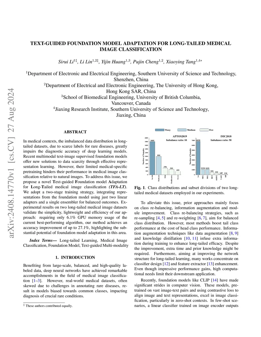 In medical contexts, the imbalanced data distribution in long-tailed datasets, due to scarce labels for rare diseases, greatly impairs the diagnostic accuracy of deep learning models. Recent multimodal text-image supervised foundation models offer new solutions to data scarcity through effective representation learning. However, their limited medical-specific pretraining hinders their performance in medical image classification relative to natural images. To address this issue, we propose a novel Text-guided Foundation model Adaptation for Long-Tailed medical image classification (TFA-LT). We adopt a two-stage training strategy, integrating representations from the foundation model using just two linear adapters and a single ensembler for balanced outcomes. Experimental results on two long-tailed medical image datasets validate the simplicity, lightweight and efficiency of our approach: requiring only 6.1% GPU memory usage of the current best-performing algorithm, our method achieves an accuracy improvement of up to 27.1%, highlighting the substantial potential of foundation model adaptation in this area.