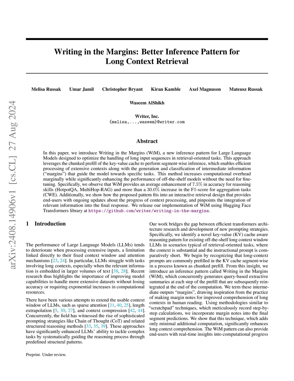 In this paper, we introduce Writing in the Margins (WiM), a new inference pattern for Large Language Models designed to optimize the handling of long input sequences in retrieval-oriented tasks. This approach leverages the chunked prefill of the key-value cache to perform segment-wise inference, which enables efficient processing of extensive contexts along with the generation and classification of intermediate information ("margins") that guide the model towards specific tasks. This method increases computational overhead marginally while significantly enhancing the performance of off-the-shelf models without the need for fine-tuning. Specifically, we observe that WiM provides an average enhancement of 7.5% in accuracy for reasoning skills (HotpotQA, MultiHop-RAG) and more than a 30.0% increase in the F1-score for aggregation tasks (CWE). Additionally, we show how the proposed pattern fits into an interactive retrieval design that provides end-users with ongoing updates about the progress of context processing, and pinpoints the integration of relevant information into the final response. We release our implementation of WiM using Hugging Face Transformers library at https://github.com/writer/writing-in-the-margins.