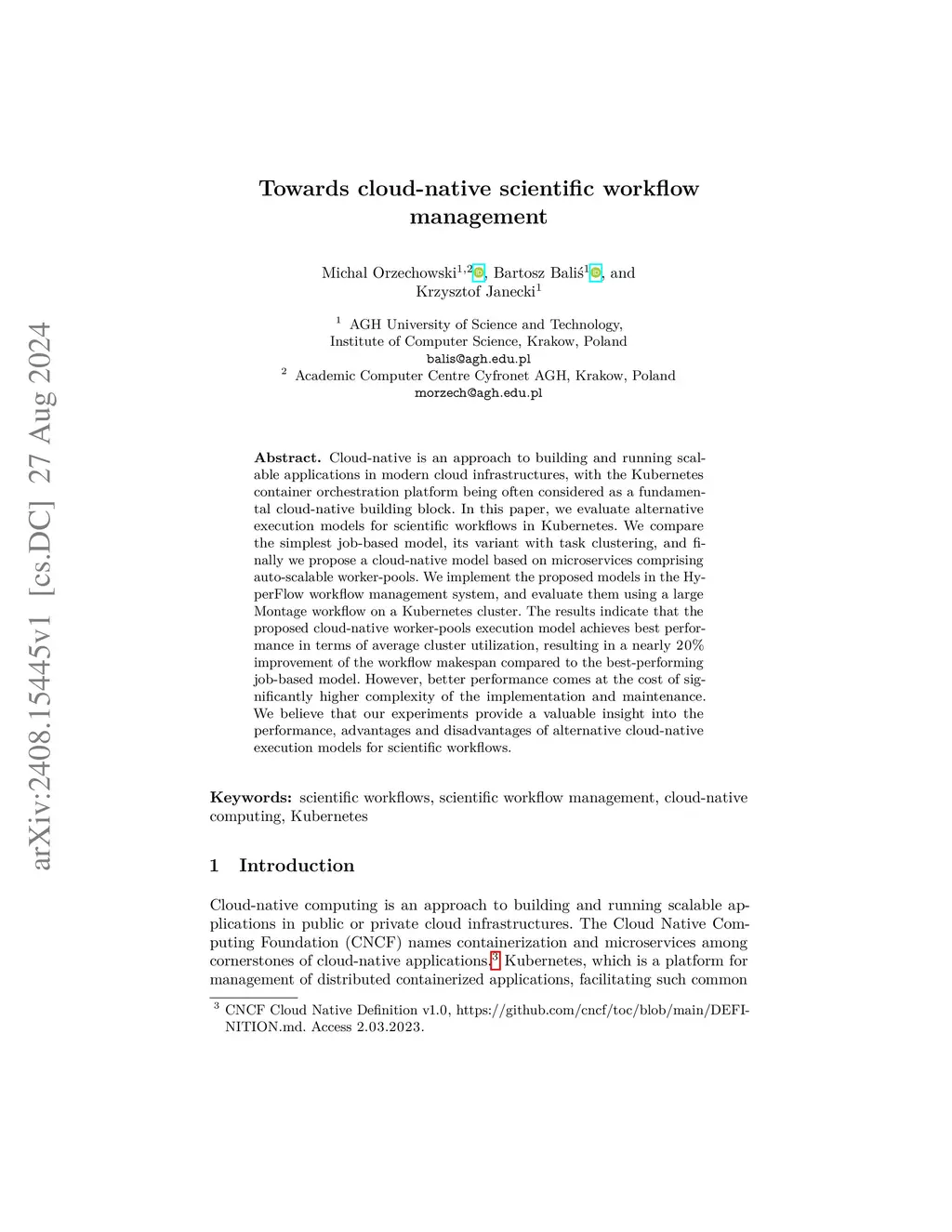 Cloud-native is an approach to building and running scalable applications in modern cloud infrastructures, with the Kubernetes container orchestration platform being often considered as a fundamental cloud-native building block. In this paper, we evaluate alternative execution models for scientific workflows in Kubernetes. We compare the simplest job-based model, its variant with task clustering, and finally we propose a cloud-native model based on microservices comprising auto-scalable worker-pools. We implement the proposed models in the HyperFlow workflow management system, and evaluate them using a large Montage workflow on a Kubernetes cluster. The results indicate that the proposed cloud-native worker-pools execution model achieves best performance in terms of average cluster utilization, resulting in a nearly 20\% improvement of the workflow makespan compared to the best-performing job-based model. However, better performance comes at the cost of significantly higher complexity of the implementation and maintenance. We believe that our experiments provide a valuable insight into the performance, advantages and disadvantages of alternative cloud-native execution models for scientific workflows.