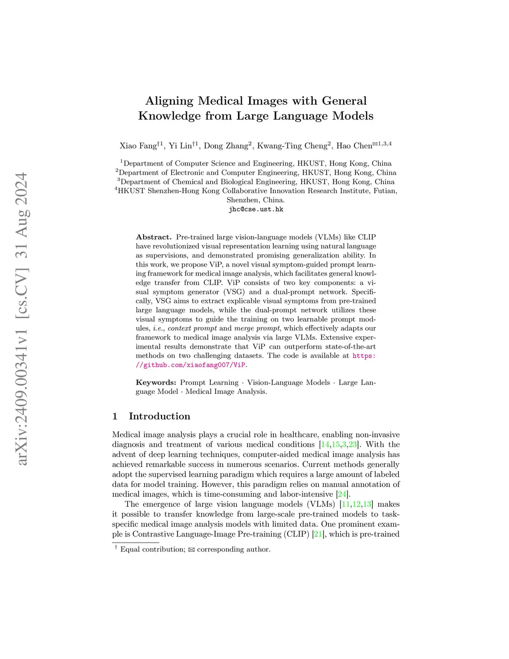 Pre-trained large vision-language models (VLMs) like CLIP have revolutionized visual representation learning using natural language as supervisions, and demonstrated promising generalization ability. In this work, we propose ViP, a novel visual symptom-guided prompt learning framework for medical image analysis, which facilitates general knowledge transfer from CLIP. ViP consists of two key components: a visual symptom generator (VSG) and a dual-prompt network. Specifically, VSG aims to extract explicable visual symptoms from pre-trained large language models, while the dual-prompt network utilizes these visual symptoms to guide the training on two learnable prompt modules, i.e., context prompt and merge prompt, which effectively adapts our framework to medical image analysis via large VLMs. Extensive experimental results demonstrate that ViP can outperform state-of-the-art methods on two challenging datasets.