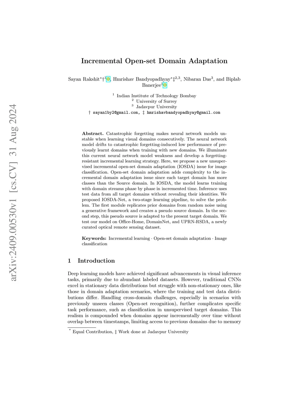 Catastrophic forgetting makes neural network models unstable when learning visual domains consecutively. The neural network model drifts to catastrophic forgetting-induced low performance of previously learnt domains when training with new domains. We illuminate this current neural network model weakness and develop a forgetting-resistant incremental learning strategy. Here, we propose a new unsupervised incremental open-set domain adaptation (IOSDA) issue for image classification. Open-set domain adaptation adds complexity to the incremental domain adaptation issue since each target domain has more classes than the Source domain. In IOSDA, the model learns training with domain streams phase by phase in incremented time. Inference uses test data from all target domains without revealing their identities. We proposed IOSDA-Net, a two-stage learning pipeline, to solve the problem. The first module replicates prior domains from random noise using a generative framework and creates a pseudo source domain. In the second step, this pseudo source is adapted to the present target domain. We test our model on Office-Home, DomainNet, and UPRN-RSDA, a newly curated optical remote sensing dataset.