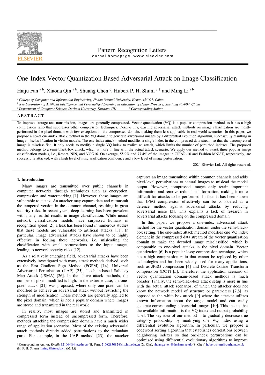 One-Index Vector Quantization Based Adversarial Attack on Image