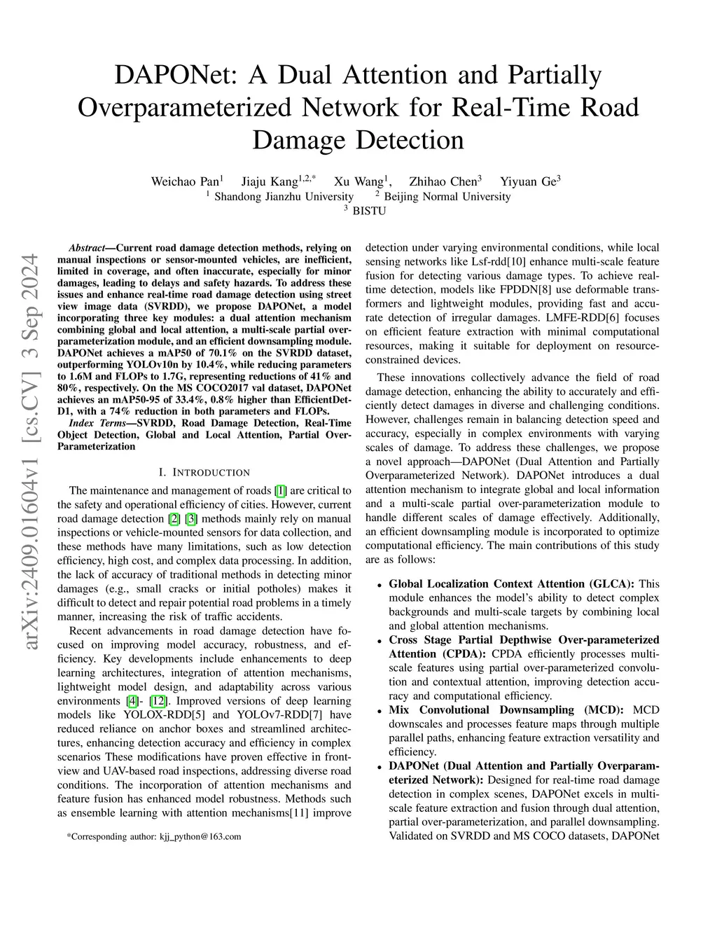 Current road damage detection methods, relying on manual inspections or sensor-mounted vehicles, are inefficient, limited in coverage, and often inaccurate, especially for minor damages, leading to delays and safety hazards. To address these issues and enhance real-time road damage detection using street view image data (SVRDD), we propose DAPONet, a model incorporating three key modules: a dual attention mechanism combining global and local attention, a multi-scale partial over-parameterization module, and an efficient downsampling module. DAPONet achieves a mAP50 of 70.1% on the SVRDD dataset, outperforming YOLOv10n by 10.4%, while reducing parameters to 1.6M and FLOPs to 1.7G, representing reductions of 41% and 80%, respectively. On the MS COCO2017 val dataset, DAPONet achieves an mAP50-95 of 33.4%, 0.8% higher than EfficientDet-D1, with a 74% reduction in both parameters and FLOPs.