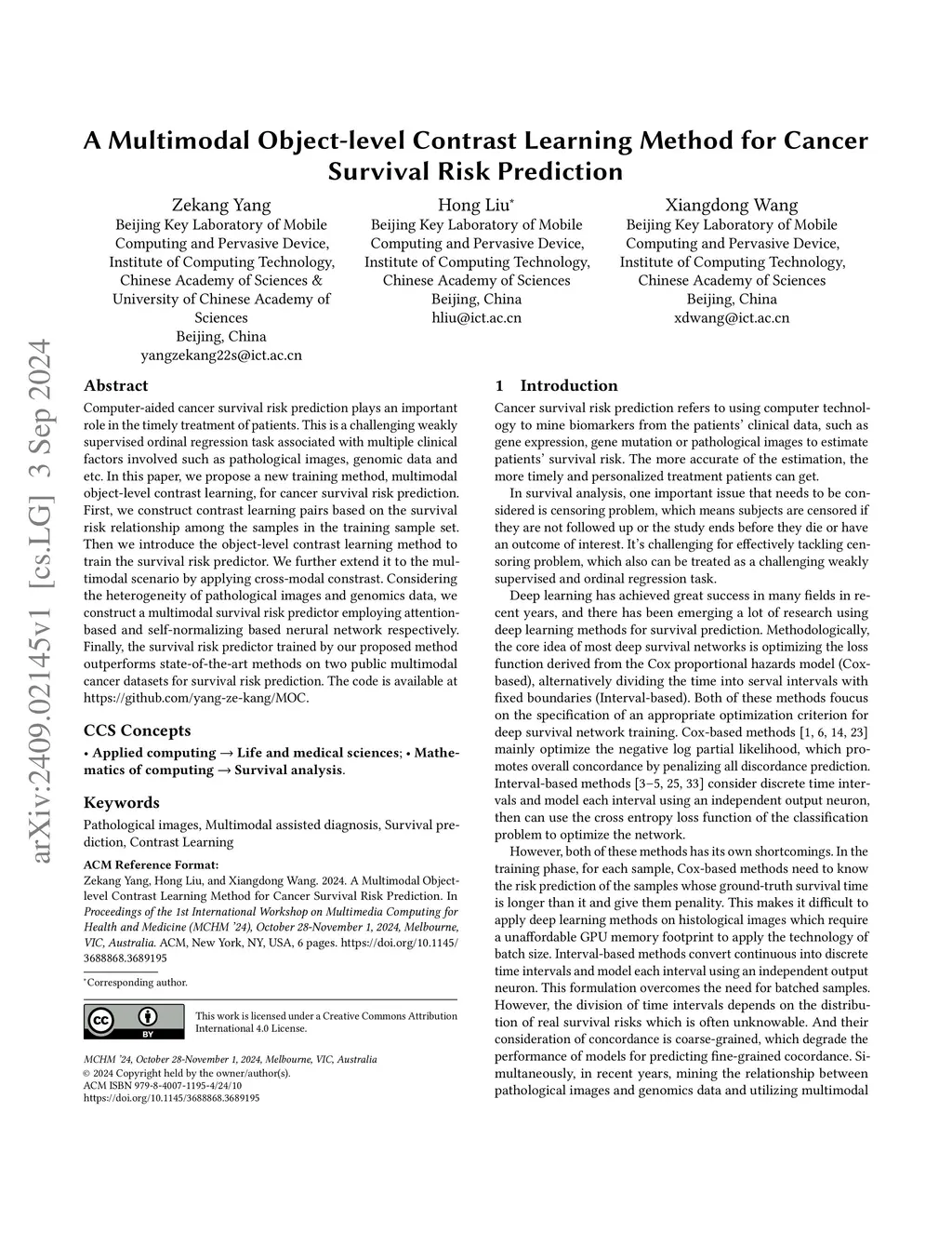 A Multimodal Object-level Contrast Learning Method for Cancer Survival
