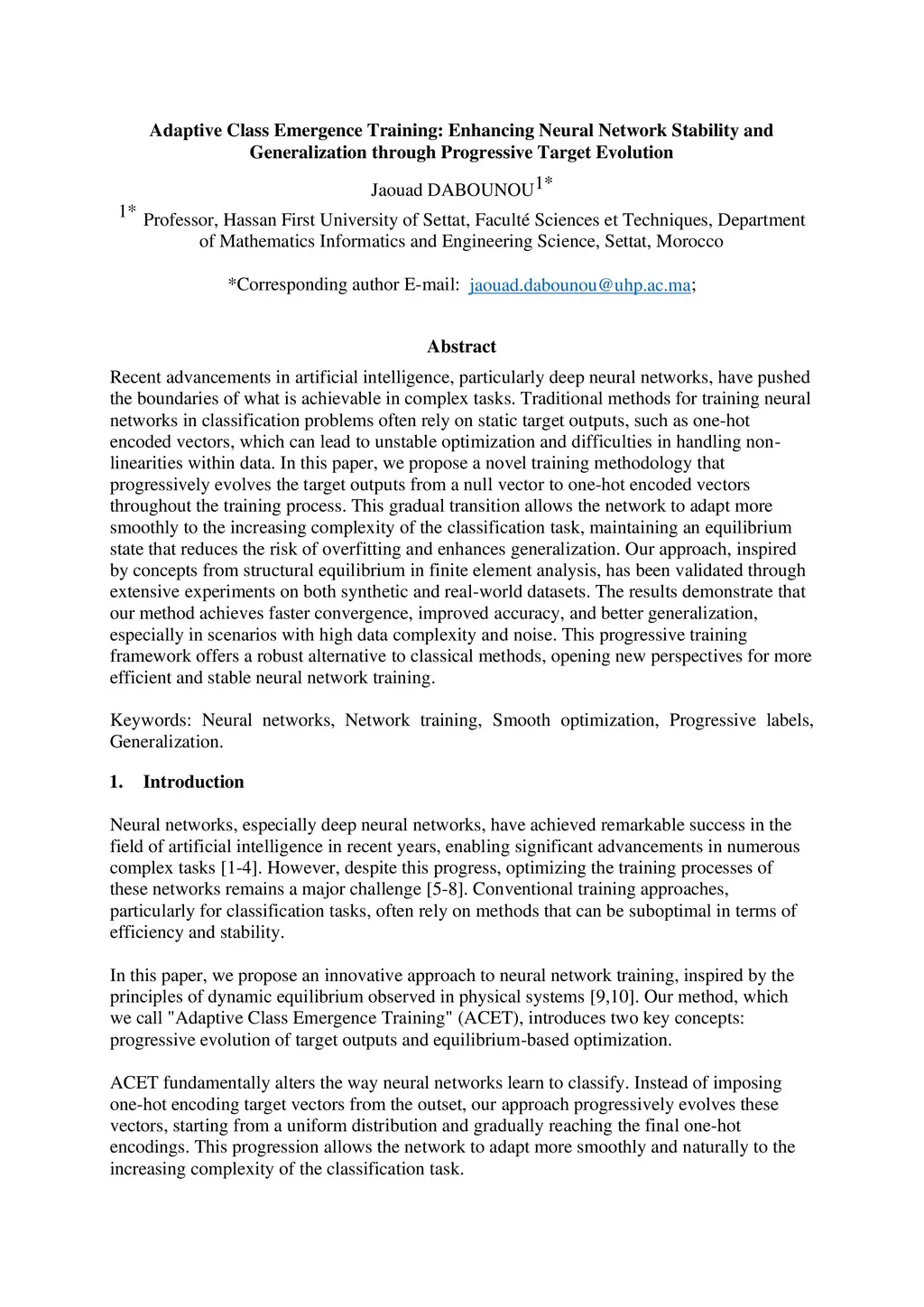 Recent advancements in artificial intelligence, particularly deep neural networks, have pushed the boundaries of what is achievable in complex tasks. Traditional methods for training neural networks in classification problems often rely on static target outputs, such as one-hot encoded vectors, which can lead to unstable optimization and difficulties in handling non-linearities within data. In this paper, we propose a novel training methodology that progressively evolves the target outputs from a null vector to one-hot encoded vectors throughout the training process. This gradual transition allows the network to adapt more smoothly to the increasing complexity of the classification task, maintaining an equilibrium state that reduces the risk of overfitting and enhances generalization. Our approach, inspired by concepts from structural equilibrium in finite element analysis, has been validated through extensive experiments on both synthetic and real-world datasets. The results demonstrate that our method achieves faster convergence, improved accuracy, and better generalization, especially in scenarios with high data complexity and noise. This progressive training framework offers a robust alternative to classical methods, opening new perspectives for more efficient and stable neural network training.