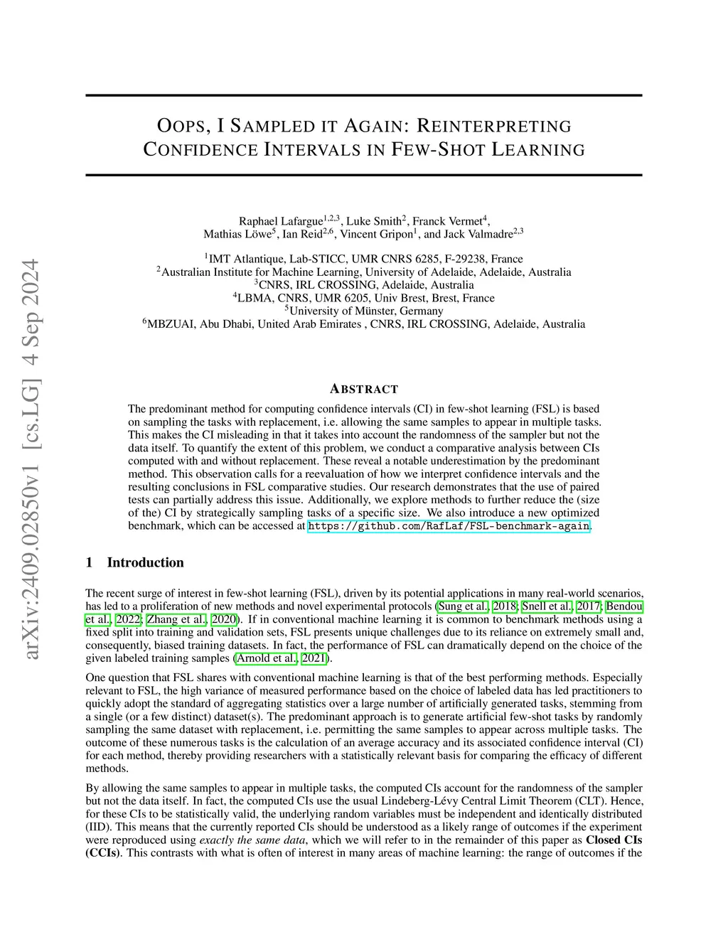 The predominant method for computing confidence intervals (CI) in few-shot learning (FSL) is based on sampling the tasks with replacement, i.e.\ allowing the same samples to appear in multiple tasks. This makes the CI misleading in that it takes into account the randomness of the sampler but not the data itself. To quantify the extent of this problem, we conduct a comparative analysis between CIs computed with and without replacement. These reveal a notable underestimation by the predominant method. This observation calls for a reevaluation of how we interpret confidence intervals and the resulting conclusions in FSL comparative studies. Our research demonstrates that the use of paired tests can partially address this issue. Additionally, we explore methods to further reduce the (size of the) CI by strategically sampling tasks of a specific size. We also introduce a new optimized benchmark, which can be accessed at https://github.com/RafLaf/FSL-benchmark-again