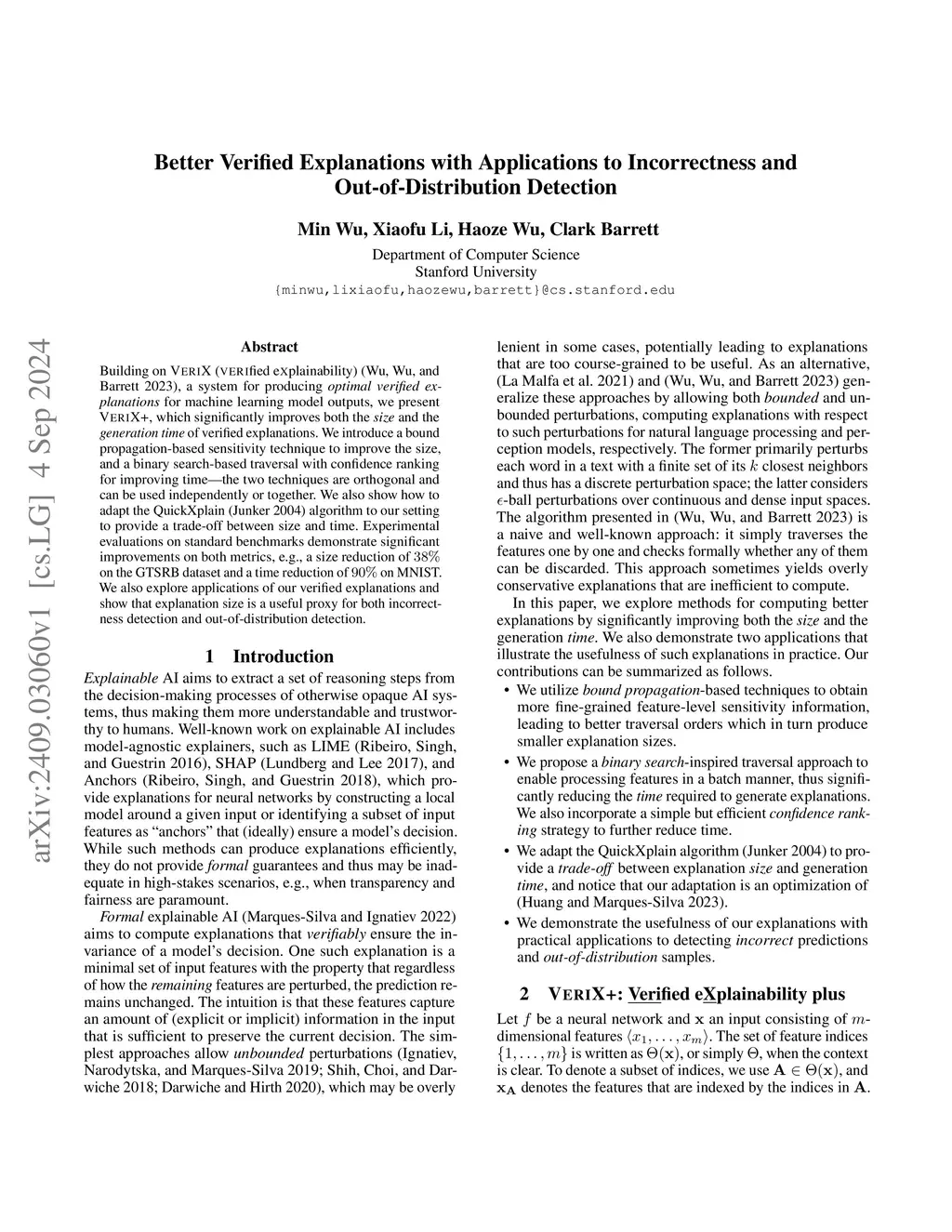 Building on VeriX (Verified eXplainability,arXiv:2212.01051), a system for producing optimal verified explanations for machine learning models, we present VeriX+, which significantly improves both the size and the generation time of formal explanations. We introduce a bound propagation-based sensitivity technique to improve the size, and a binary search-based traversal with confidence ranking for improving time -- the two techniques are orthogonal and can be used independently or together. We also show how to adapt the QuickXplain algorithm to our setting to provide a trade-off between size and time. Experimental evaluations on standard benchmarks demonstrate significant improvements on both metrics, e.g., a size reduction of on the GTSRB dataset and a time reduction of on MNIST. We demonstrate that our approach is scalable to transformers and real-world scenarios such as autonomous aircraft taxiing and sentiment analysis. We conclude by showcasing several novel applications of formal explanations.